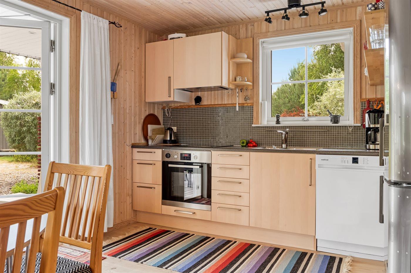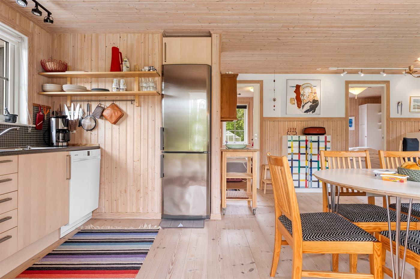 Køkkenet er udstyret med 1 køleskab. Der er 4 elkogeplader, varmluftovn samt opvaskemaskine.