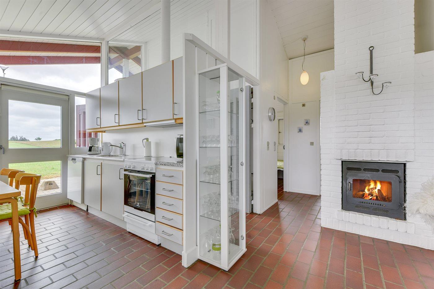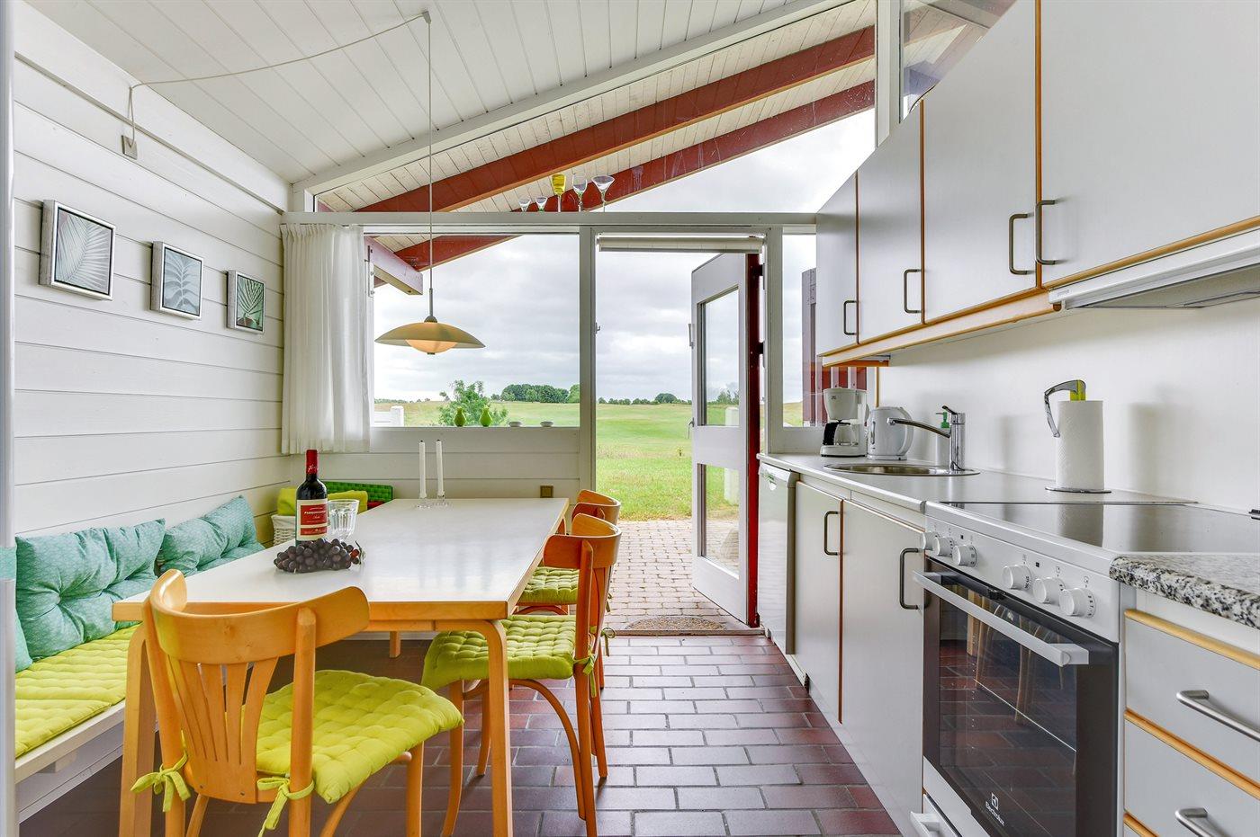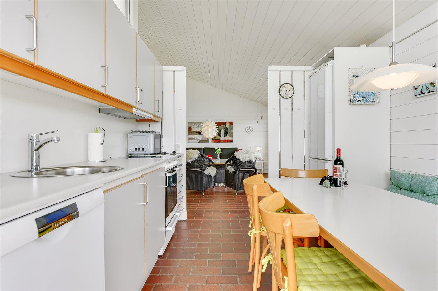 Køkkenet er udstyret med 1 køleskab. Der er 4 keramiske kogeplader. Der findes komfur med opvaskemaskine, varmluftovn, mikrobølgeovn.