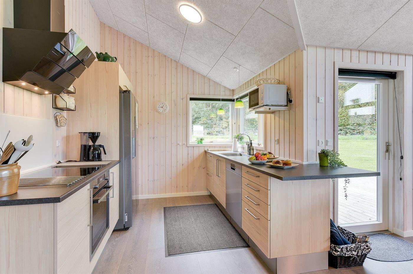 Køkkenet er udstyret med 1 køleskab. Der er 4 induktionskogeplader, varmluftovn, mikrobølgeovn samt opvaskemaskine Der er gulvvarme i køkkenet.