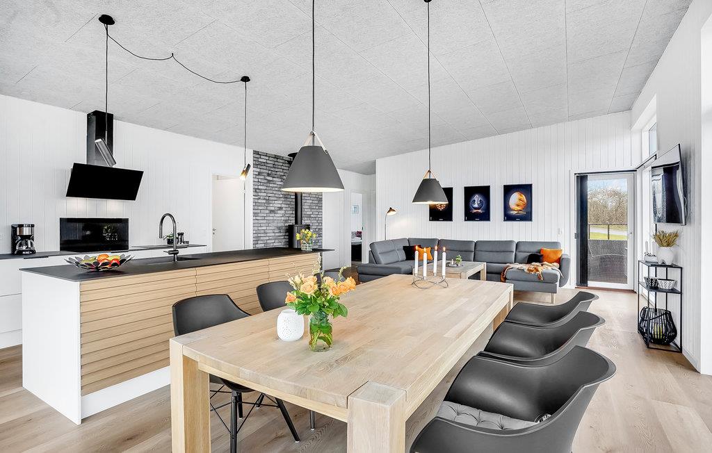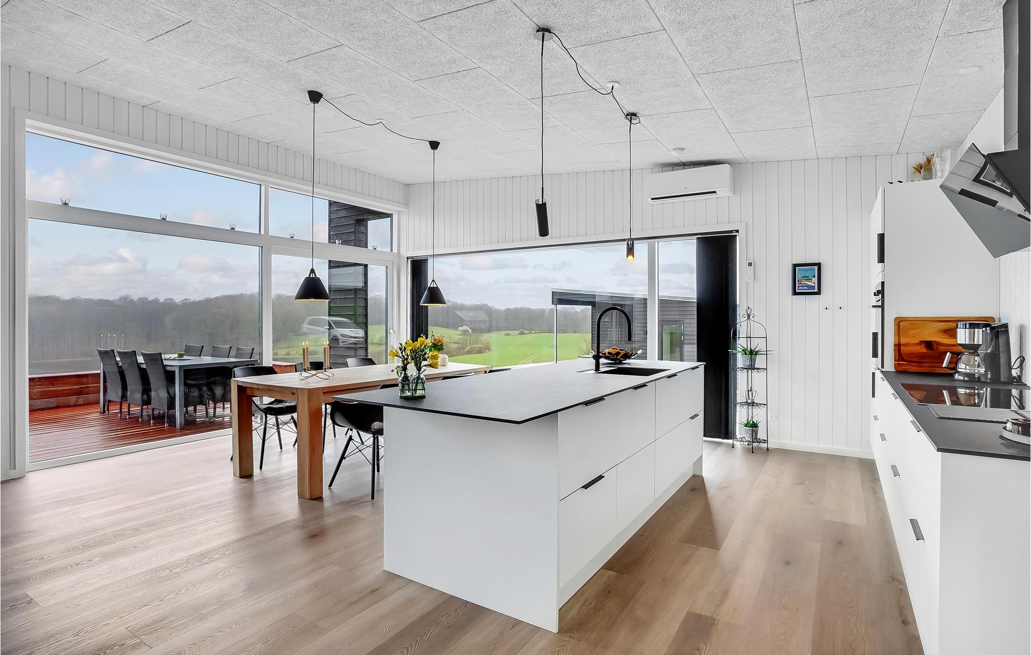 Der er lagt op til nogle herlige dage i det sønderjyske, hvor I kan lade batterierne op i dette lækre hus. Her er der lagt vægt på flotte detaljer og gode faciliteter, så det eneste I skal koncentrere jer om er at slappe af og have det rart. I opholdsrummet smelter rammerne indendørs og udendørs næsten sammen, for de store gulv til loft-vinduer sørger for en ubegrænset udsigt til de naturskønne omgivelser. Glæd jer til at dele dagens måltider i det lyse alrum, mens ilden buldrer i brændovnen, eller på terrassen, når solen er fremme.