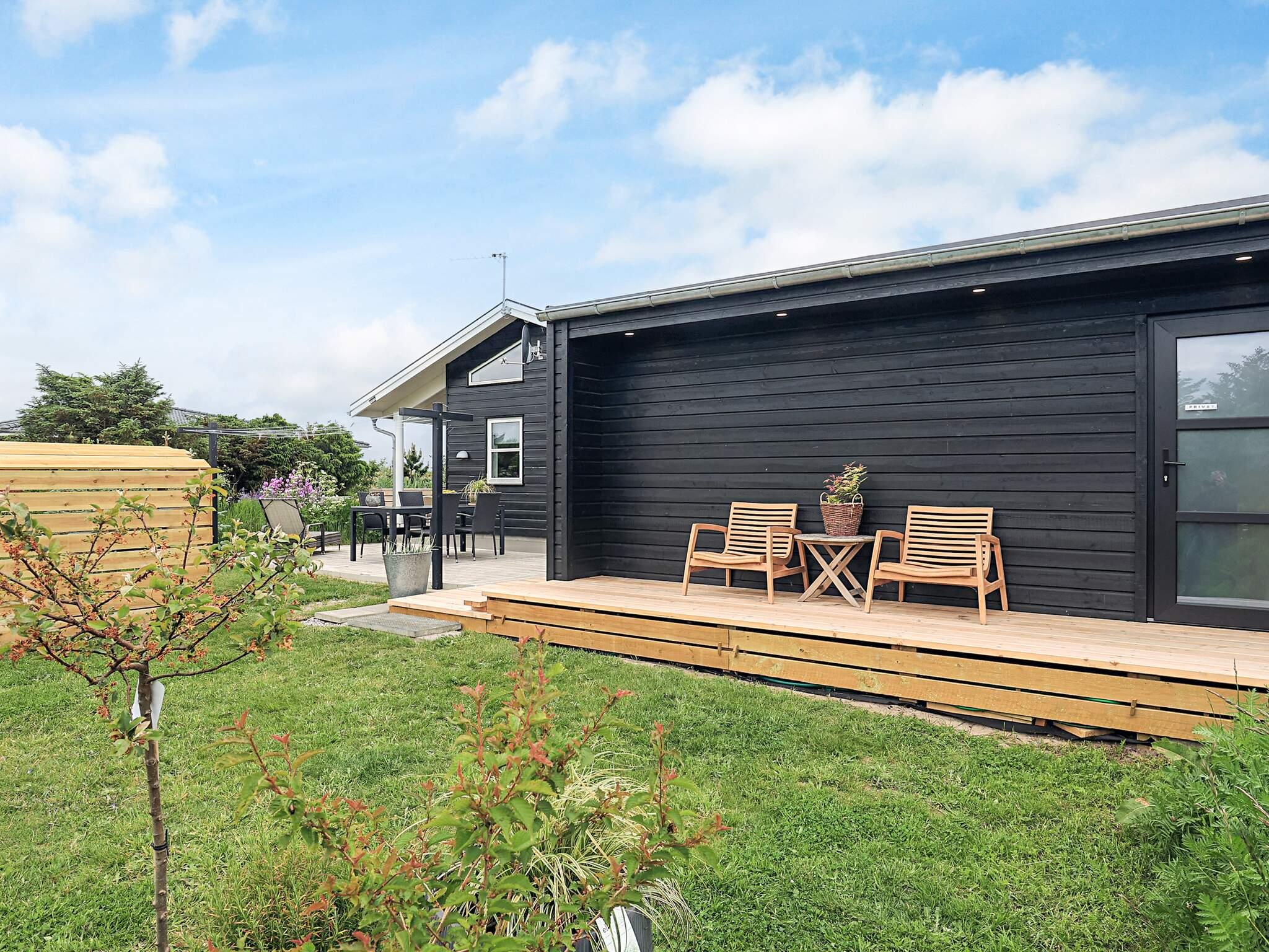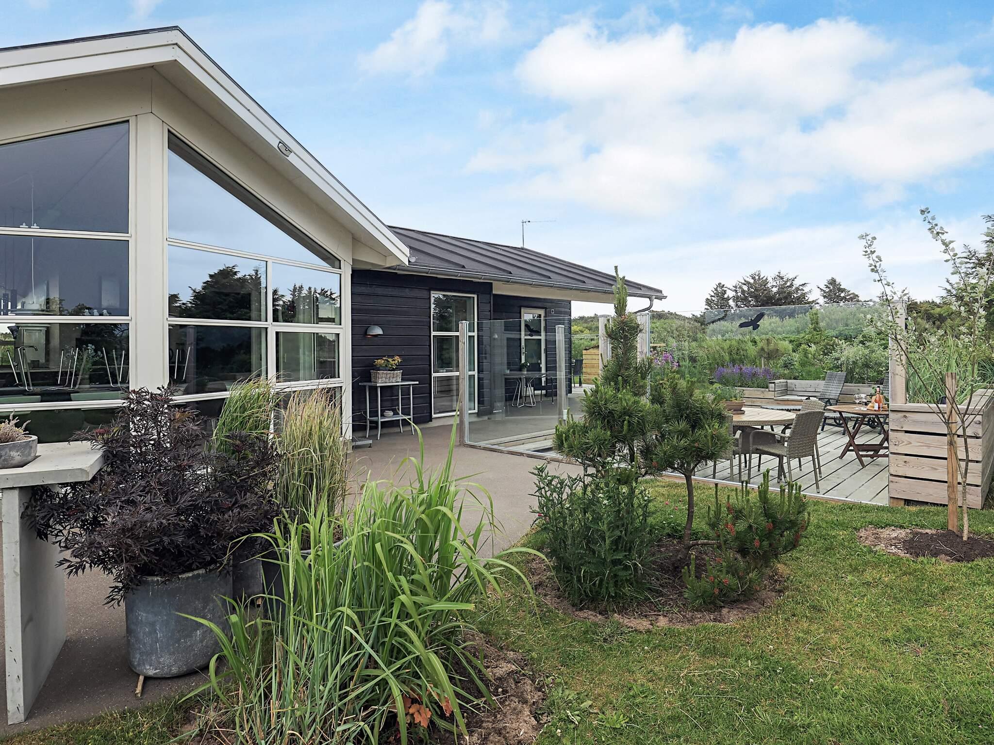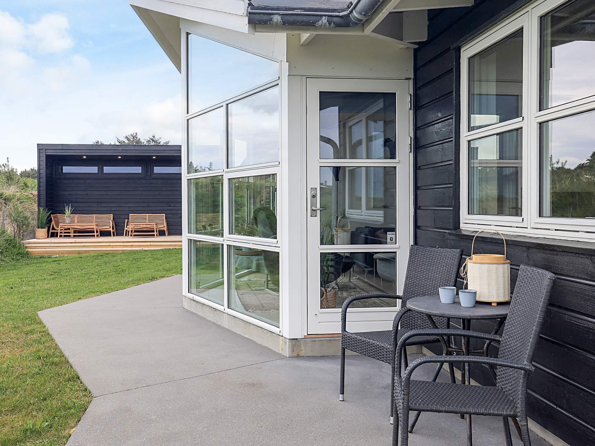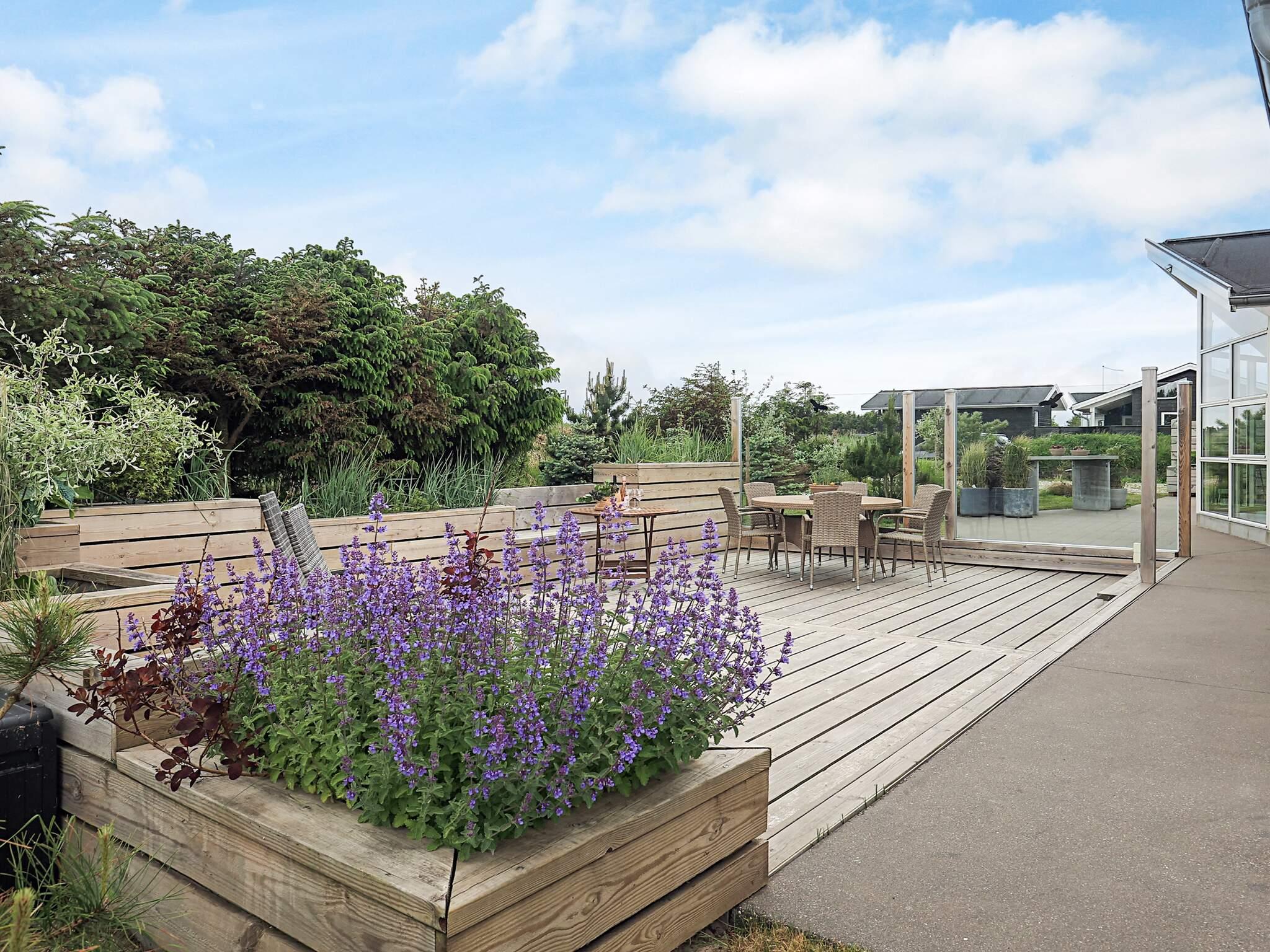 Der er indrettet beton- og træterrasser ved huset mod øst, syd og sydvest med mulighed for læ, hygge og ugenert udeliv – endvidere er der en overdækket terrasse. Der er et udhus med udebruser og gæster har adgang til et aflåseligt rum. Grunden er en naturgrund med udsøgt beplantning til gavn for biodiversitet. Udlejes IKKE til ungdomsgrupper.