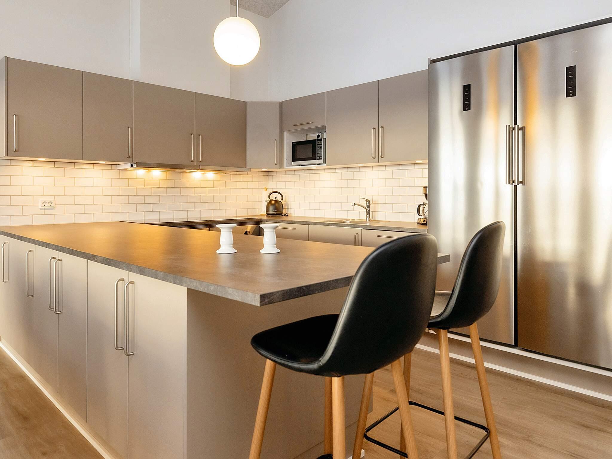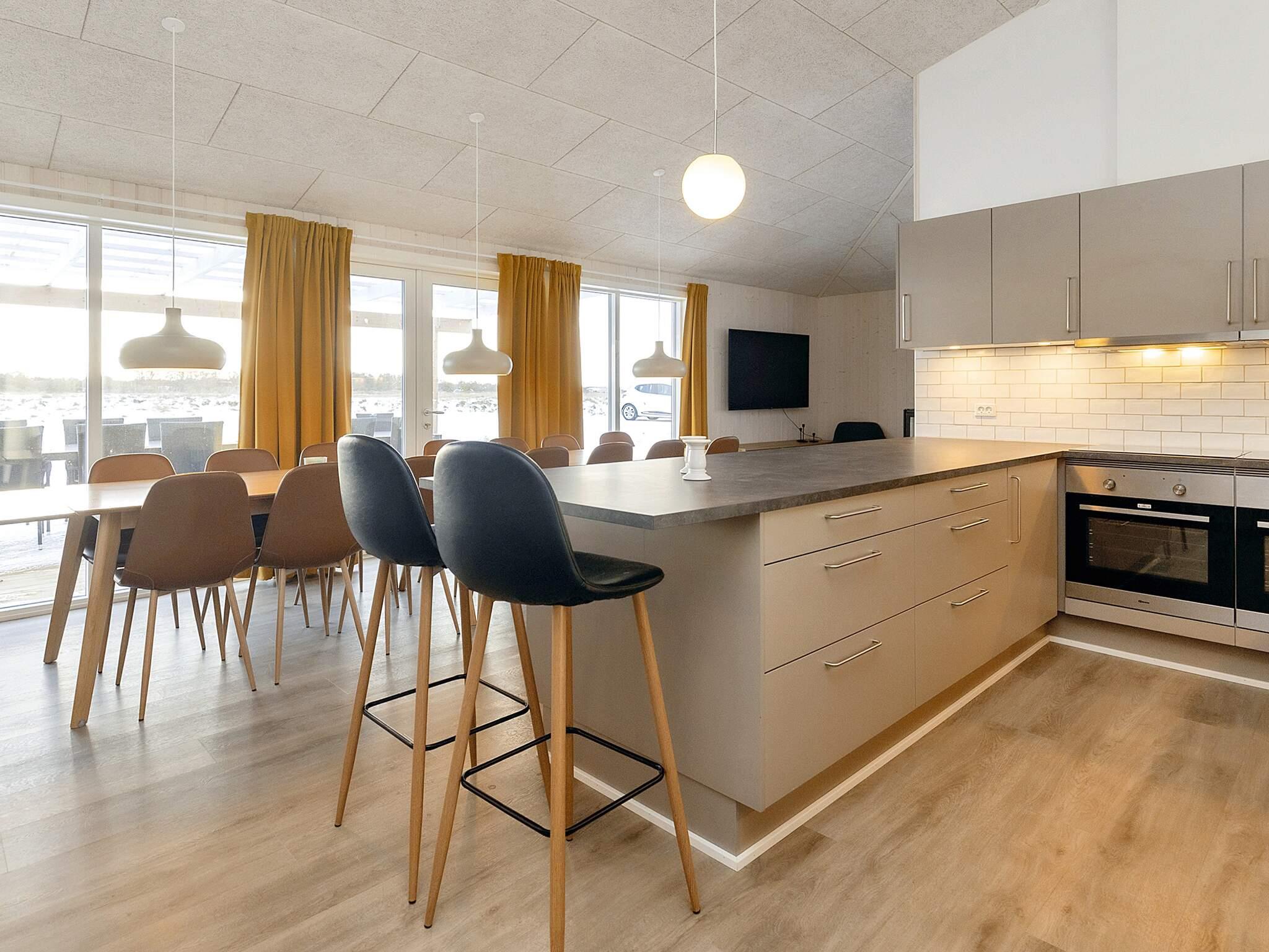 Sommerhusets hjerte udgøres af et stort og åbent opholdsrum med god akustik i forbindelse med det godt udstyrede køkken. Her er plads til at alle kan mødes og hygge med madlavning, måltider, spil, en god film etc. Rummet har flere vinduer, så det fascinerende, nordjyske lys strømmer ind, og på de varme dage kan I lukke op til terrassen.