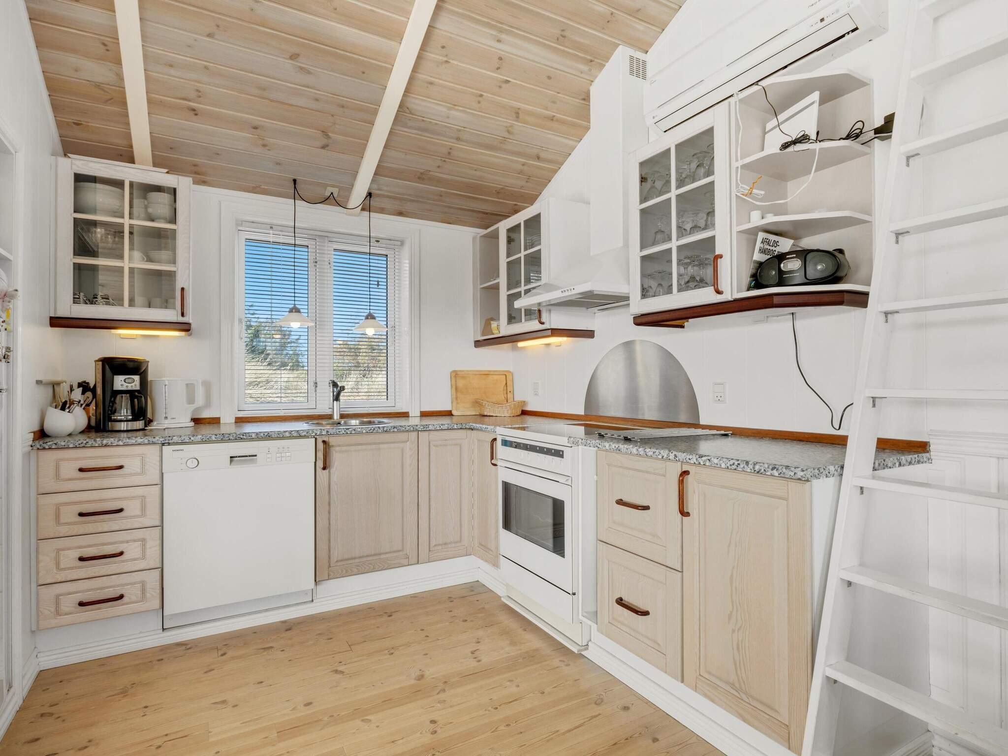 Udendørsareal: Sommerhuset ligger på en 2674 m2 stor og kuperet naturgrund, der emmer af dansk sommerhusområde. Omgivelserne er rolige og rekreative, og du har stranden kun 375 meter væk. Når Grønhøj Strand Købmand har åbent, har du indkøbsmuligheder inden for ca. 350 meter. Sommerhuset har smukke terrasser, hvoraf den ene er overdækket, og her kan du slappe af i de dejlige møbler i timevis.