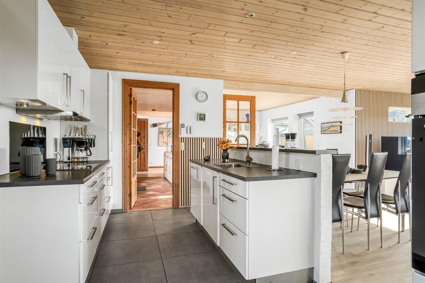 Køkkenet er udstyret med 1 køleskab. Der er 4 keramiske kogeplader, varmluftovn, mikrobølgeovn samt opvaskemaskine.