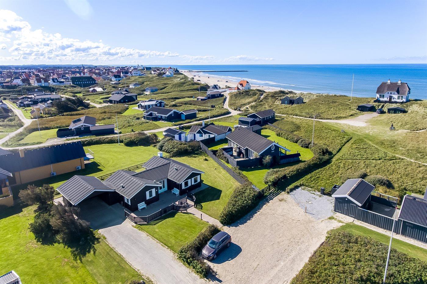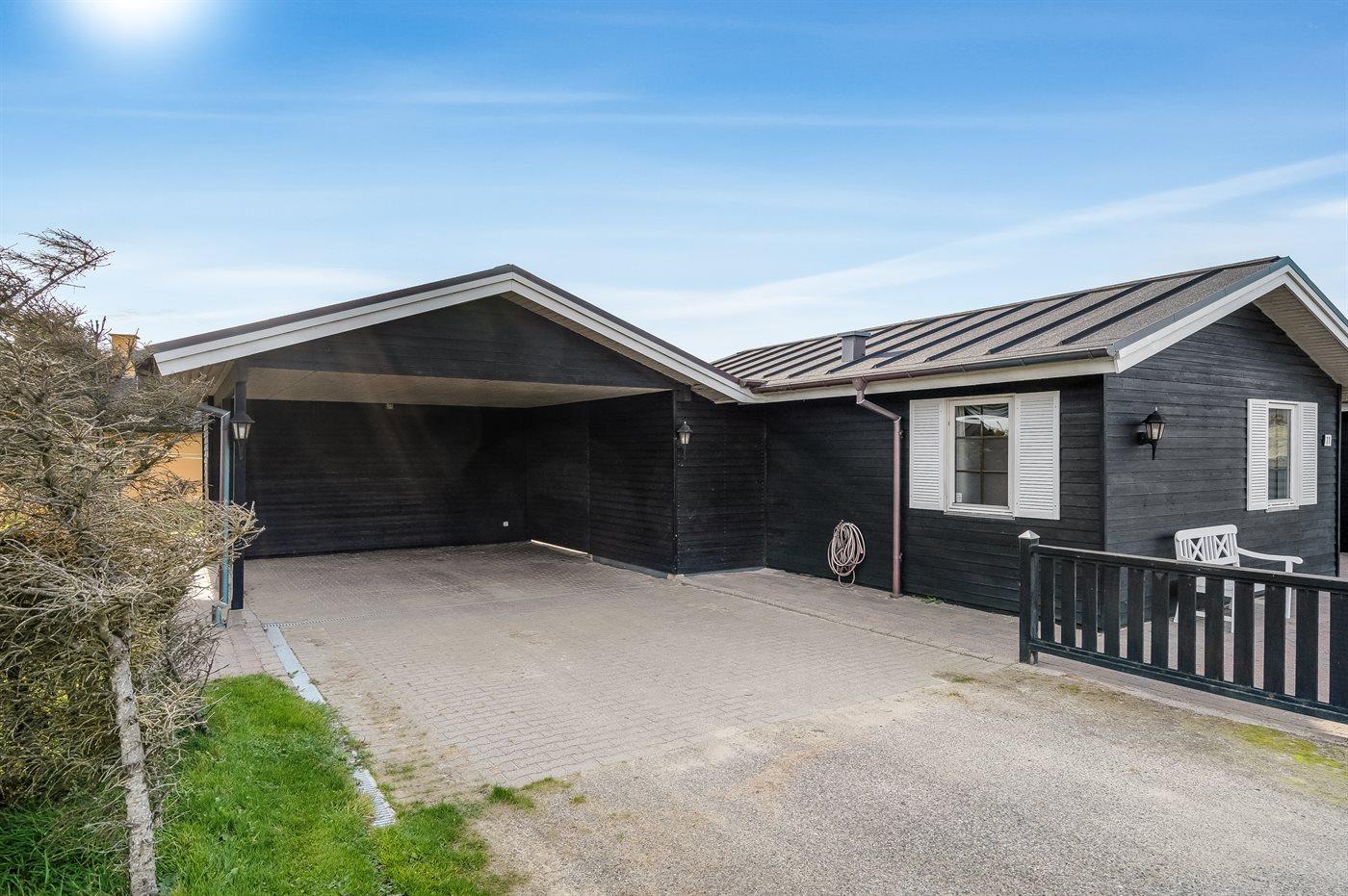 Ferieboligen er beliggende på en 1030 m² stor havegrund. Der er 120 m til havet. Nærmeste forretning er beliggende i en afstand af 800 m. Til ferieboligen hører åbent terrasseareal. Der er redskabsrum. Sandkasse. Grill til rådighed. Der er carport til rådighed. Der er installeret stik til opladning af elbil. Type 2 stik. Med 11 kW ladeeffekt. Parkering ved ferieboligen.
