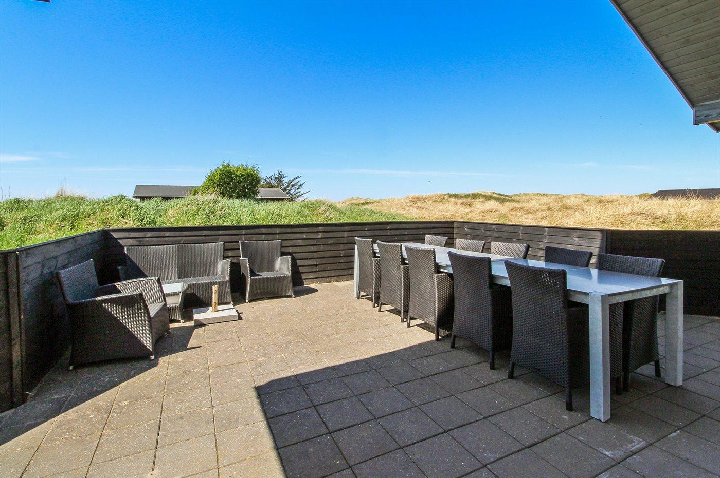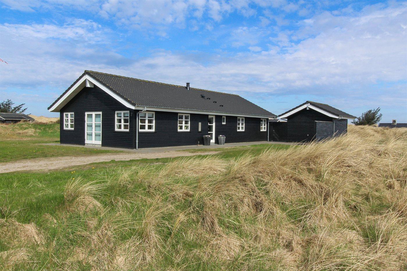 Ferieboligen er beliggende på en 2500 m² stor naturgrund. Der er 400 m til havet. Nærmeste forretning er beliggende i en afstand af 3000 m. Der er en golfbane i en afstand af 3500 m. Til ferieboligen hører 50 m² terrasseareal. Desuden er der 15 m² overdækket terrasse. Der er redskabsrum. Sandkasse. Trampolin. Der er installeret stik til opladning af elbil. Type 2 stik. Med 11 kW ladeeffekt. Parkering ved ferieboligen.