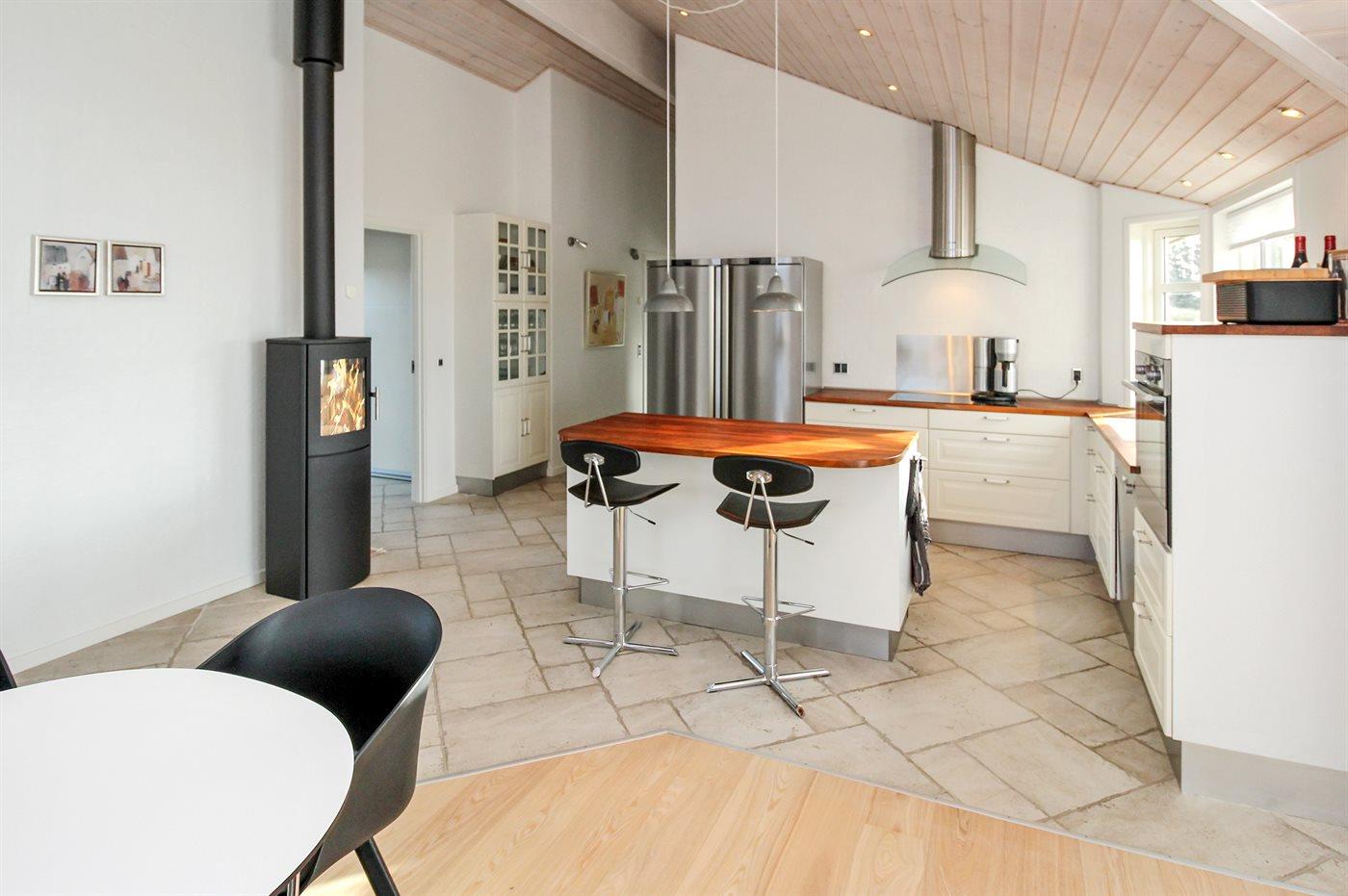 Køkkenet er udstyret med 1 køleskab. Der er 4 keramiske kogeplader, varmluftovn samt opvaskemaskine.