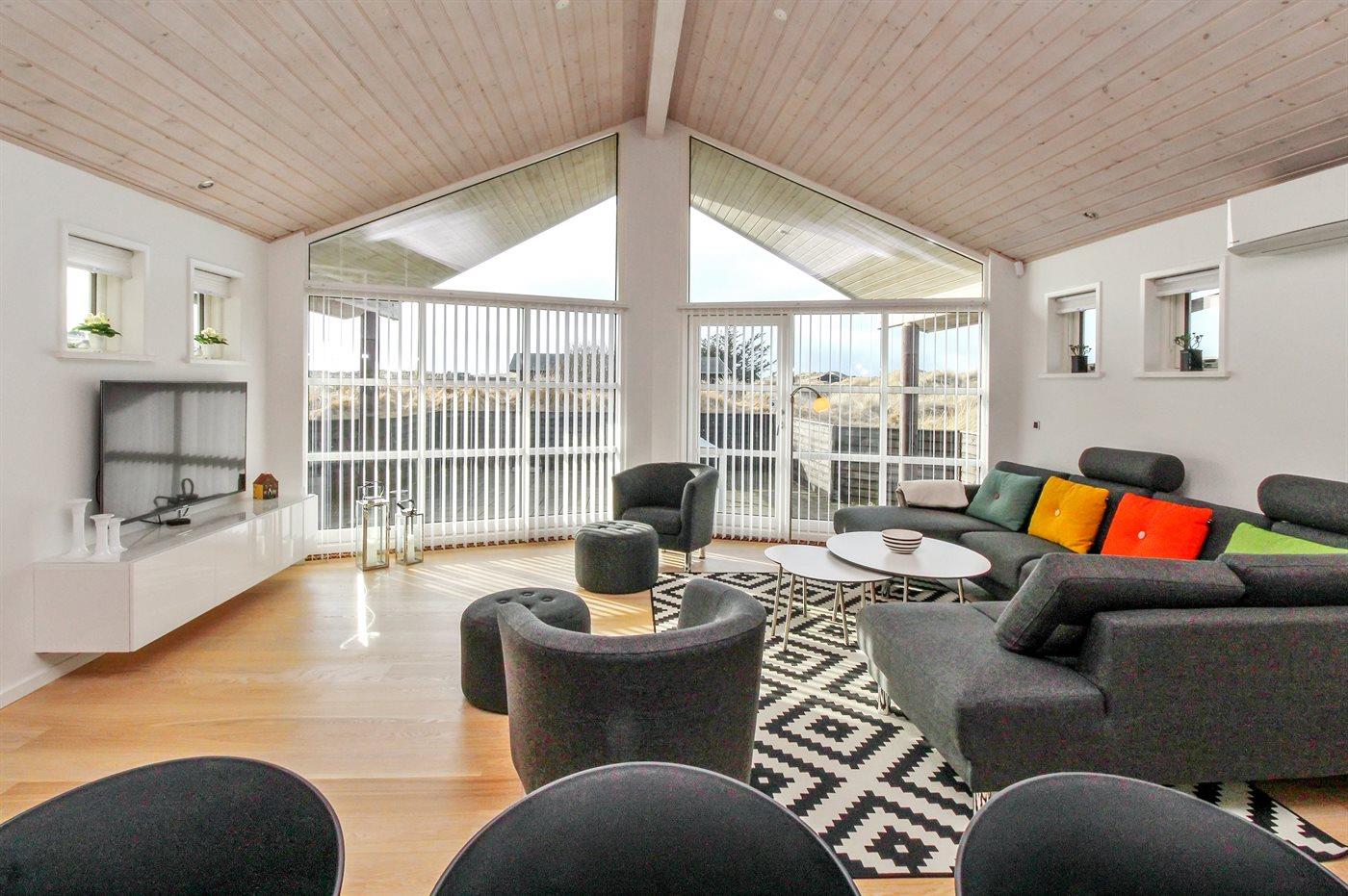 Smukt, miljøvenligt, strøm- og energibesparende sommerhus med en smagfuld indretning beliggende i rolige omgivelser, nær én af Vestkystens bedste badestrande, på en meget stor og kuperet grund med plads til boldspil og lækroge til solbadning.