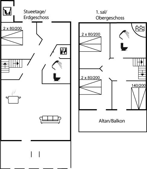 Husets sovepladser fordeler sig på 2 værelser med dobbeltseng og 1 værelse med 3/4 seng (120 cm) på første sal samt 1 værelse med dobbeltseng i stueetagen.