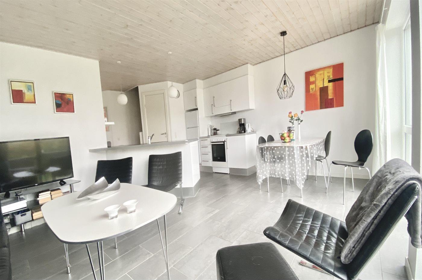 Lejligheden er bygget i 2007 i 2 etager. Til lejligheden hører åben terrasse med havemøbler samt balkon. Indvendig er der lyse vægge og trælofter. Klinkegulve med gulvvarme i opholdsstue, køkken og badeværelser samt gulvtæpper i alle værelserne. 2 dejlige badeværelser, begge med flot inventar og bruseniche. I det ene desuden 2-pers. spa og det andet med adgang til husets sauna.
