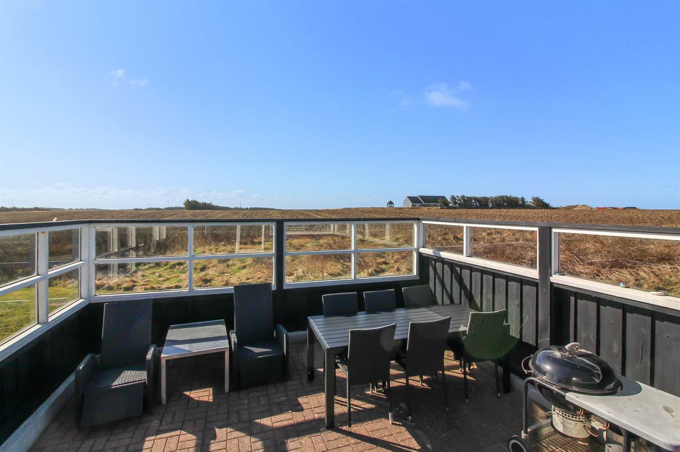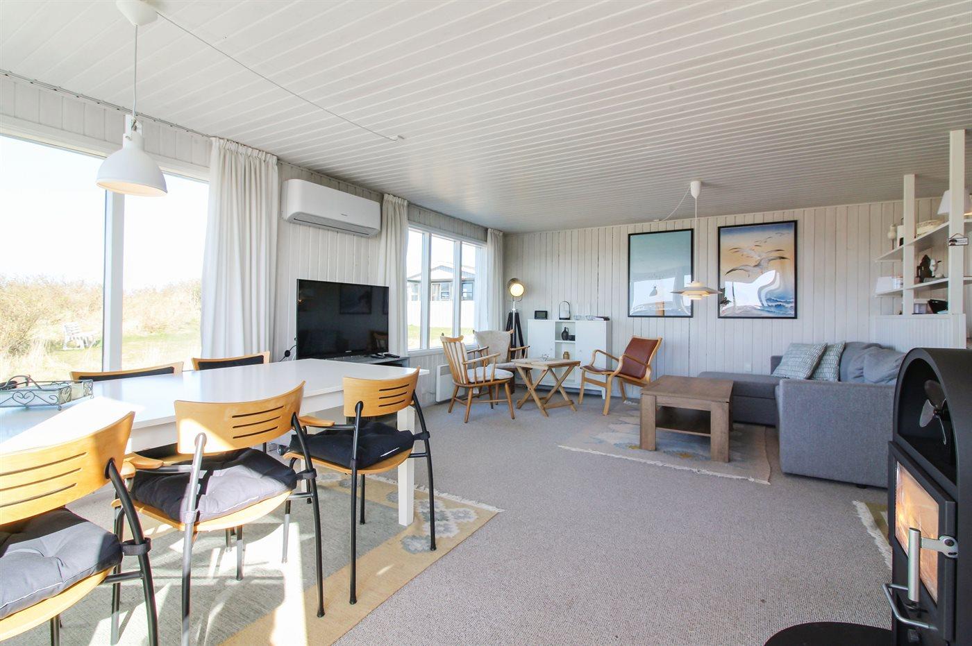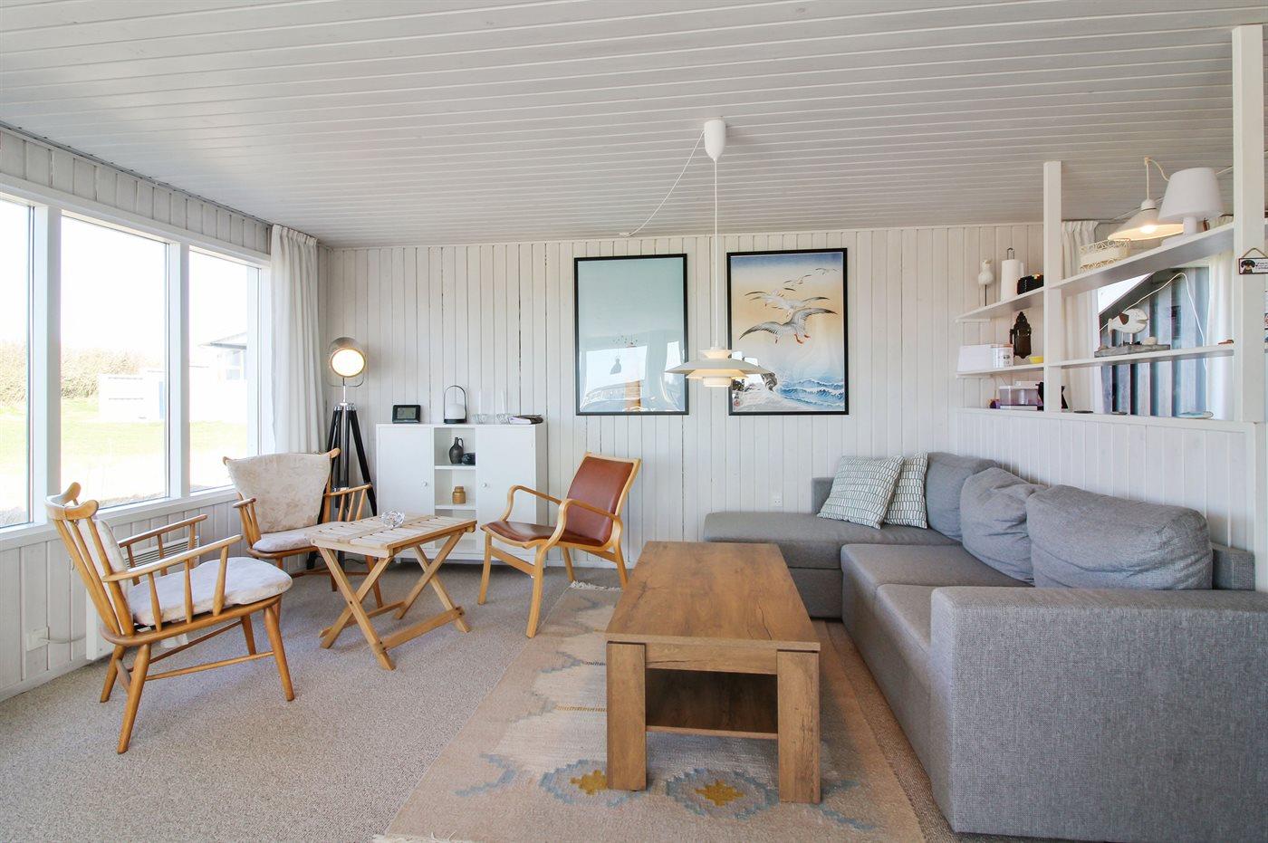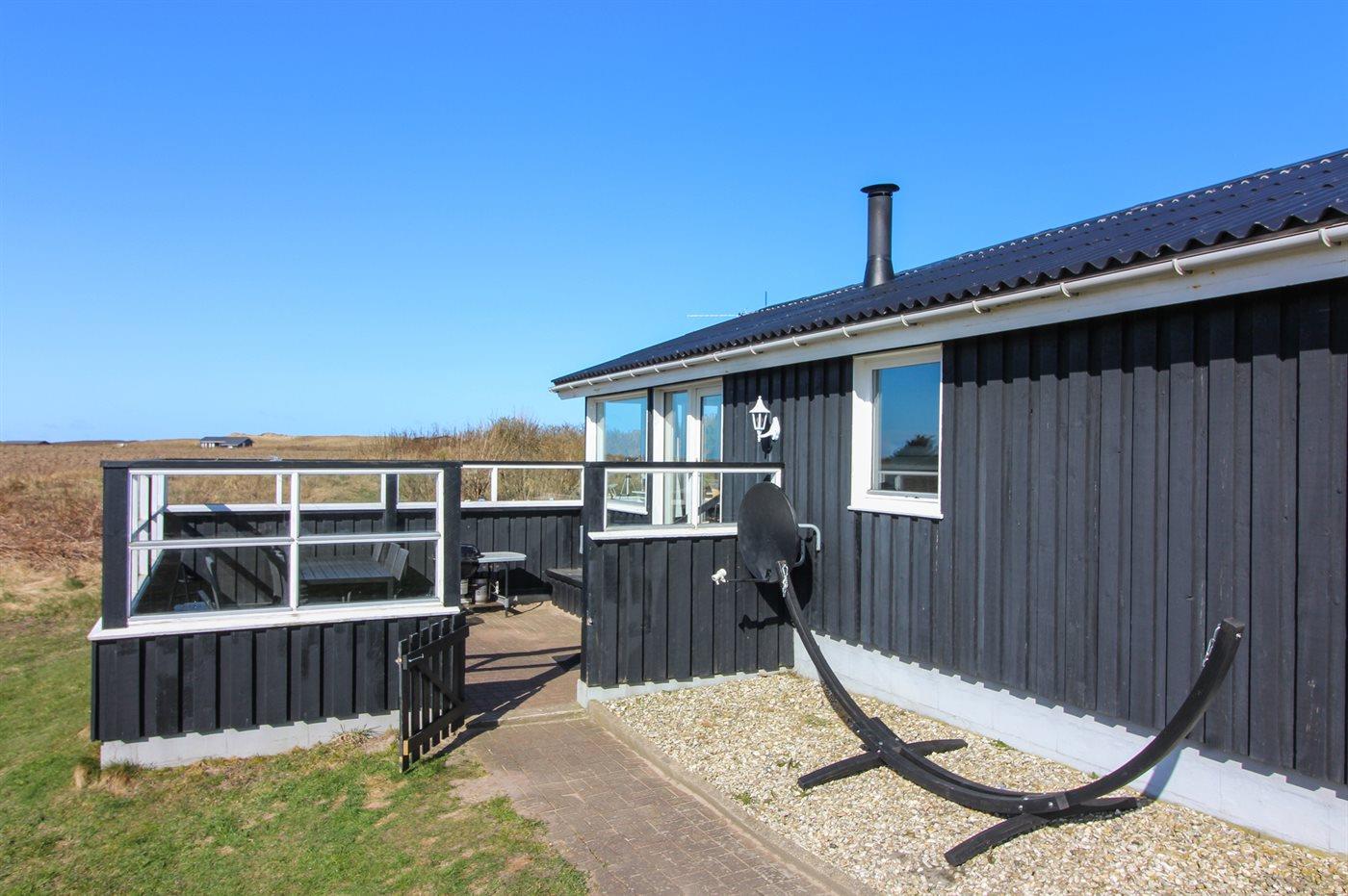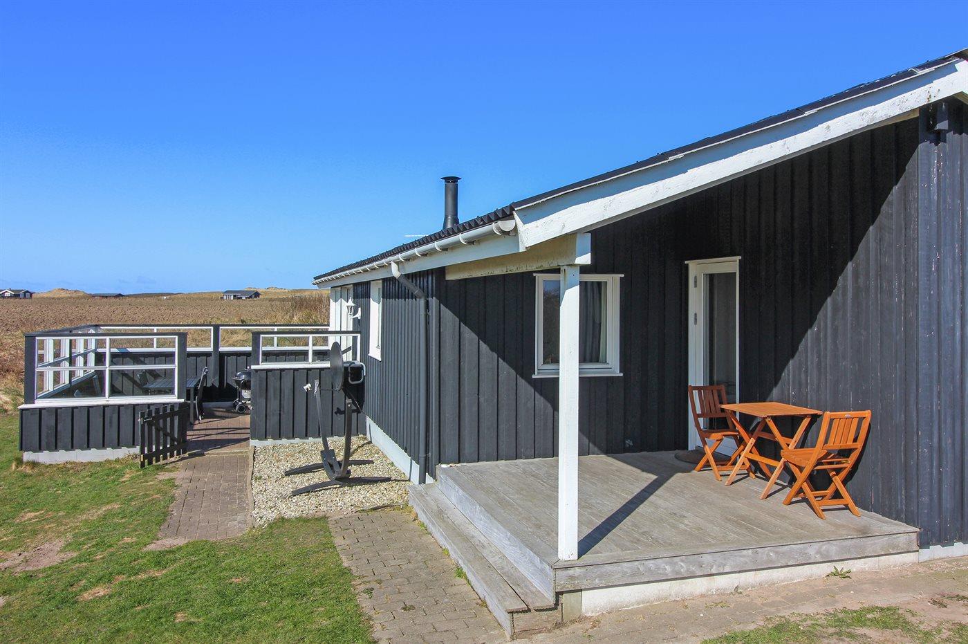 Lyst og venligt sommerhus med stort vinduesparti ud mod dejlig, indhegnet terrasse. Sydsiden af huset grænser op til marker, og der er vid udsigt over landskabet helt hen til klitterne.