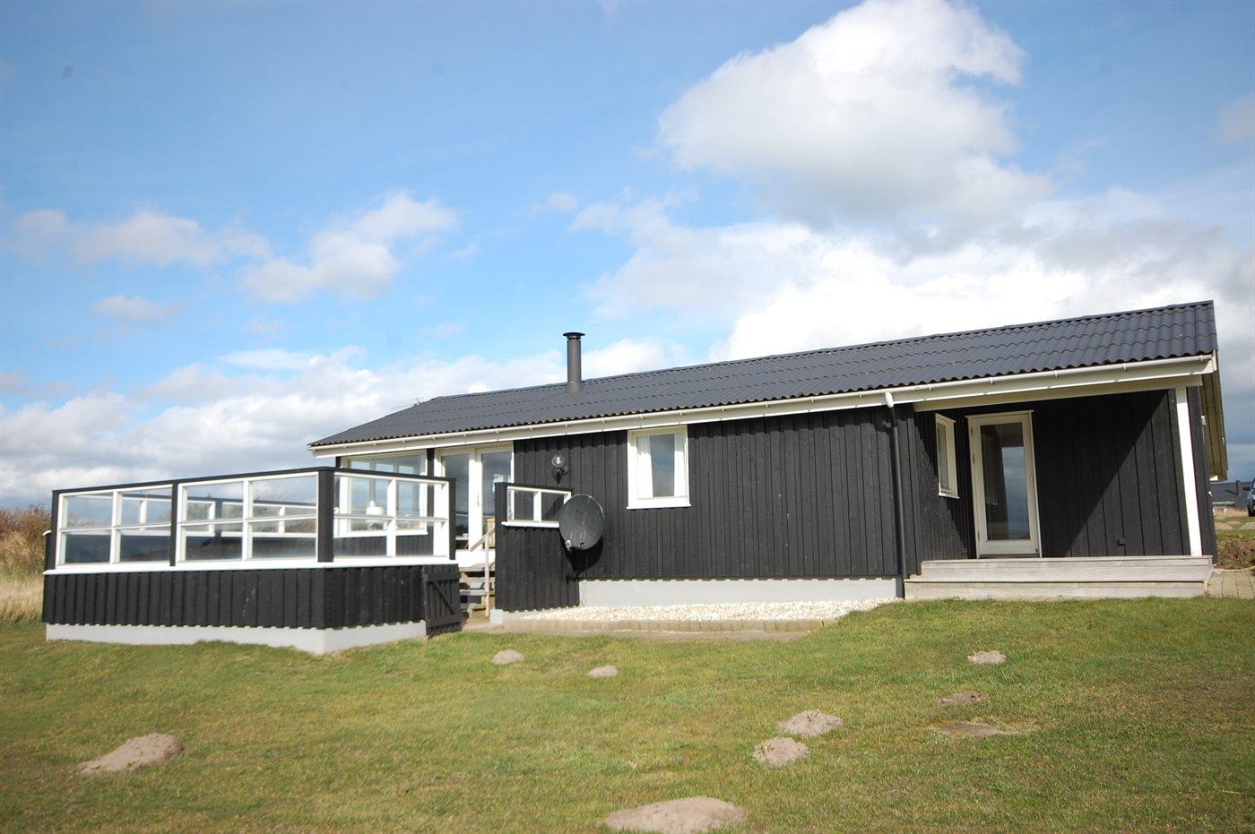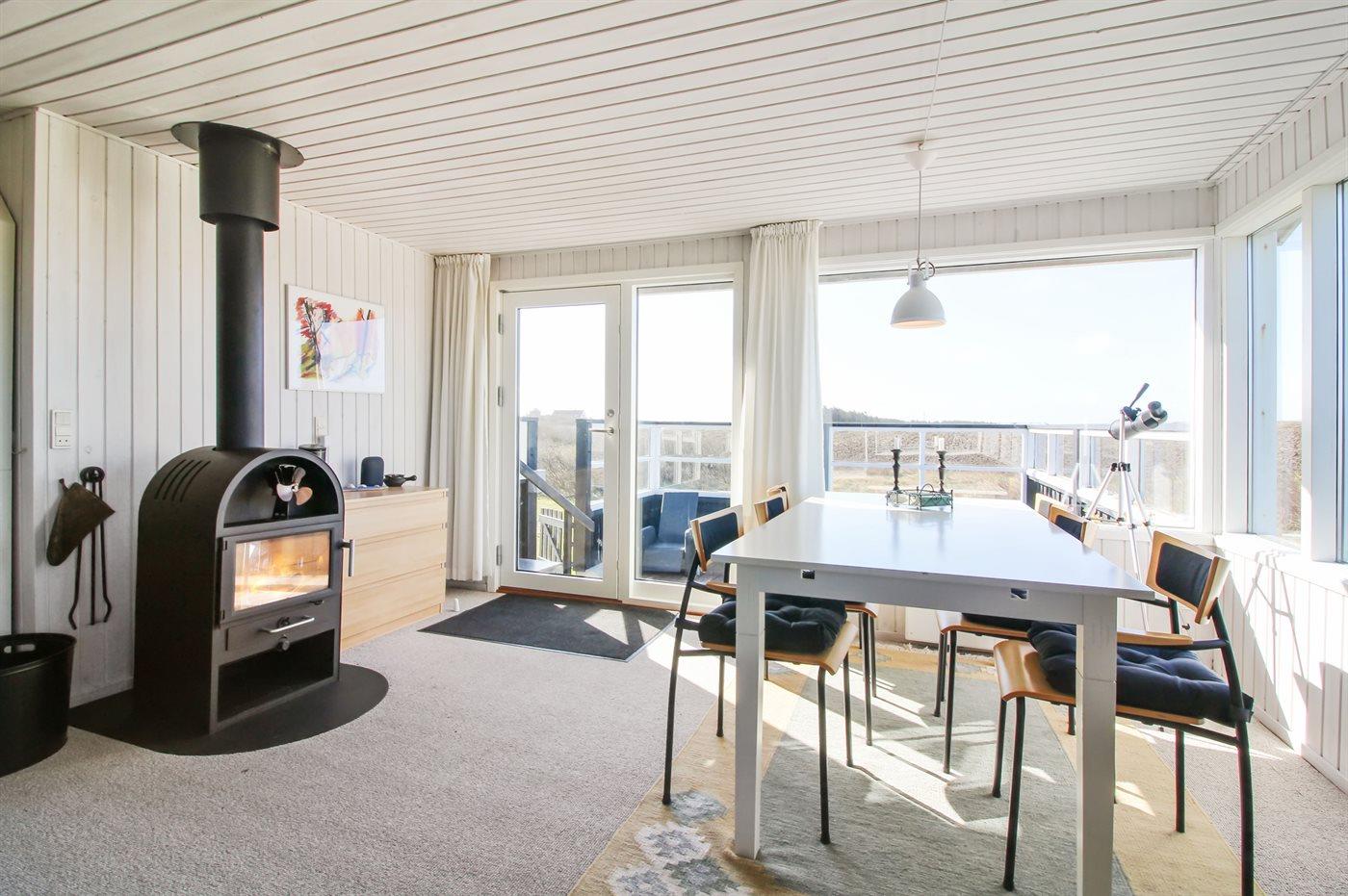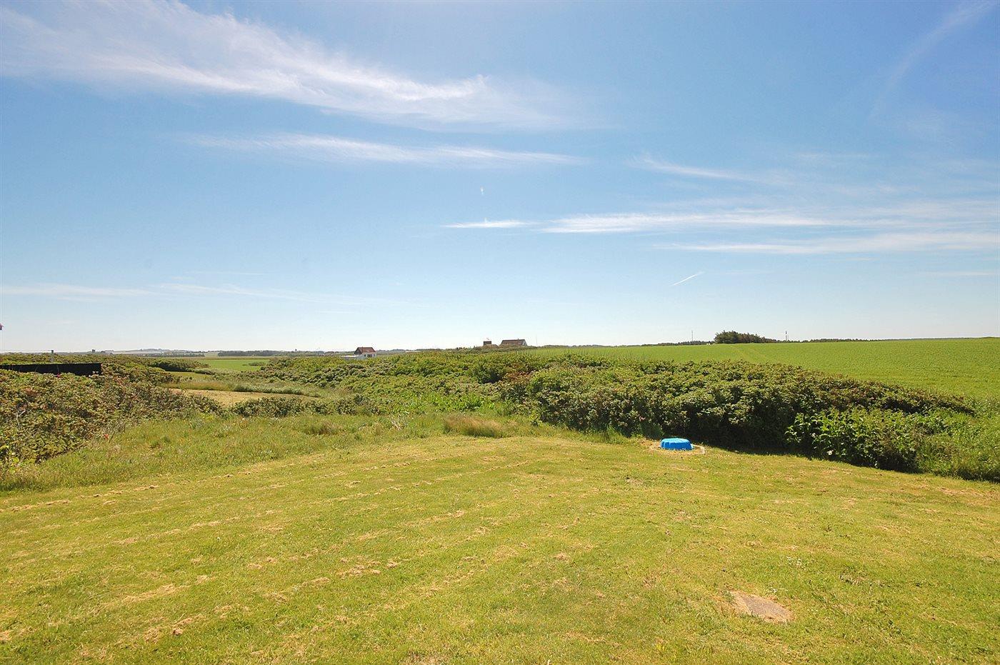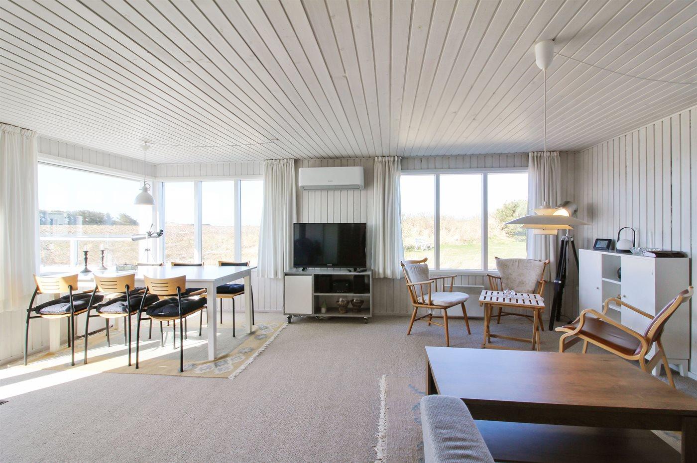 Lyst og venligt sommerhus med stort vinduesparti ud mod dejlig, indhegnet terrasse. Sydsiden af huset grænser op til marker, og der er vid udsigt over landskabet helt hen til klitterne.