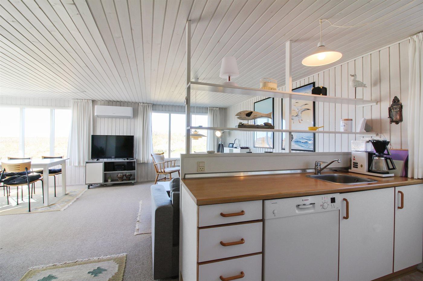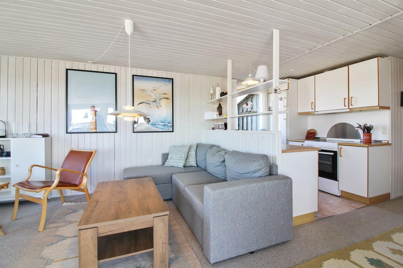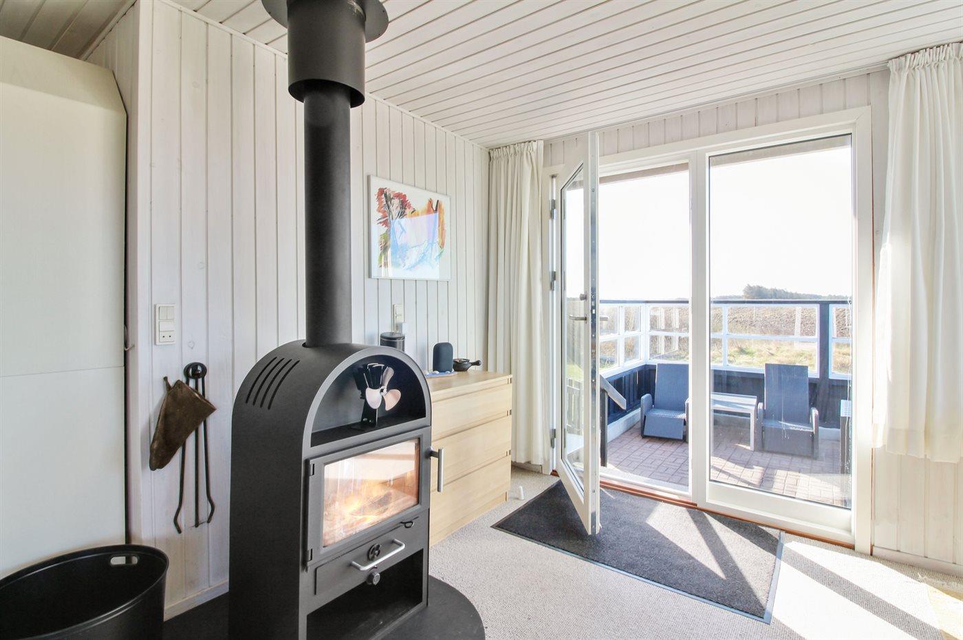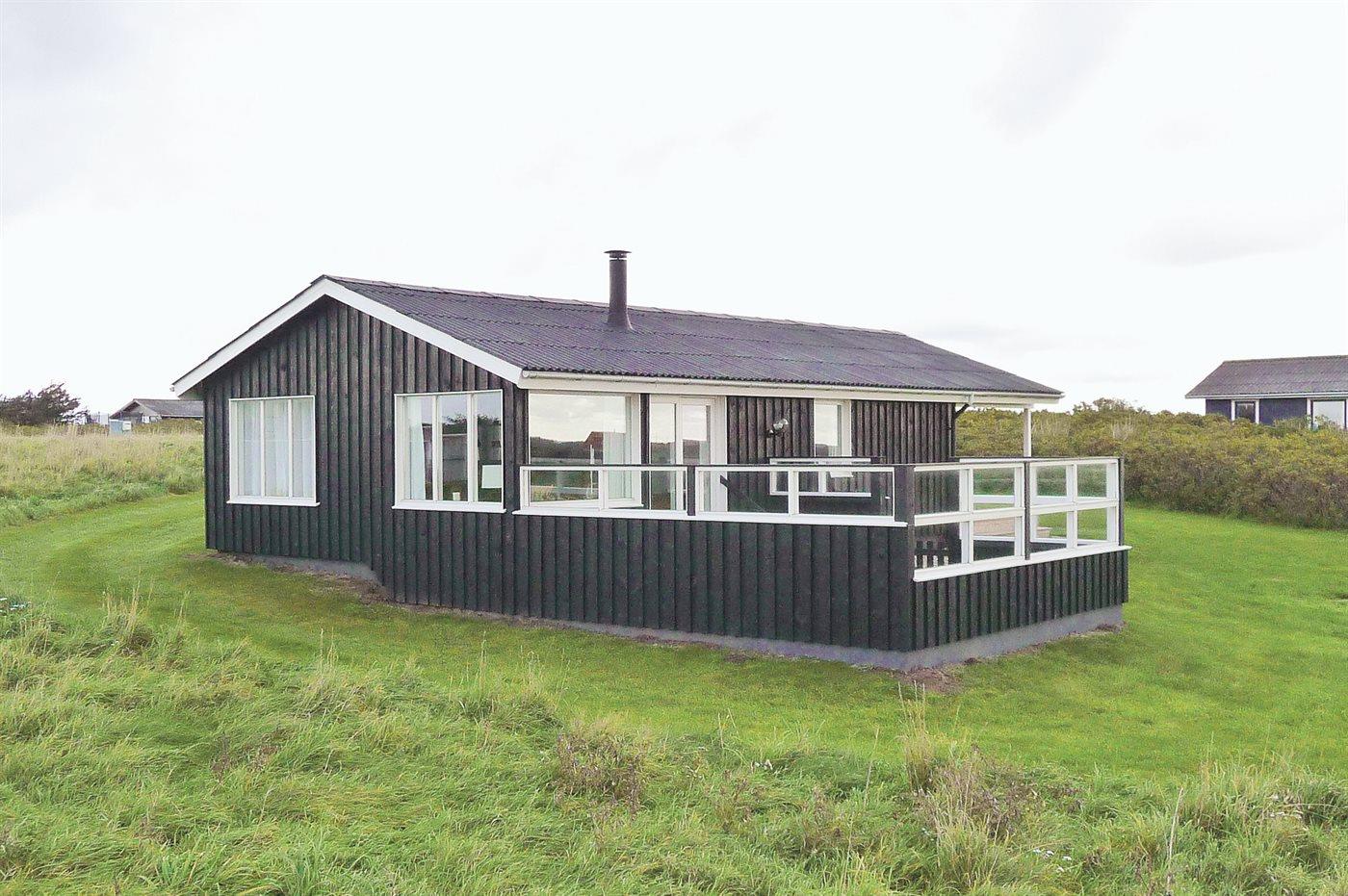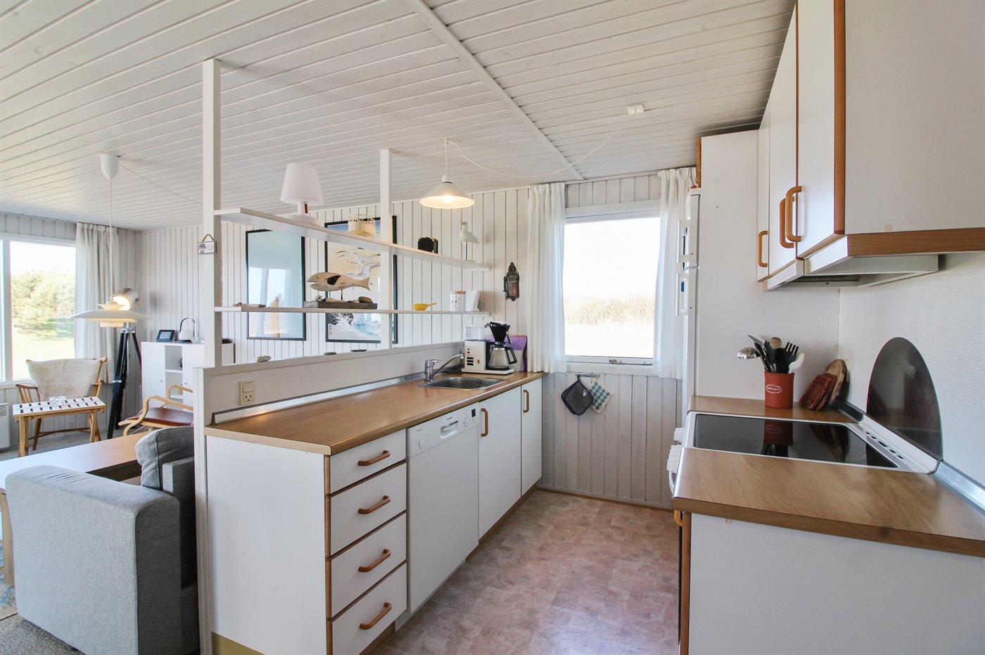 Lyst og venligt sommerhus med stort vinduesparti ud mod dejlig, indhegnet terrasse. Sydsiden af huset grænser op til marker, og der er vid udsigt over landskabet helt hen til klitterne.