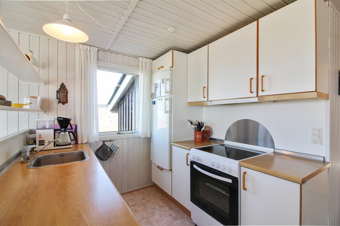 Køkkenet er udstyret med 1 køleskab. Der er 4 induktionsplader, varmluftovn, mikroovn og airfryer samt opvaskemaskine.