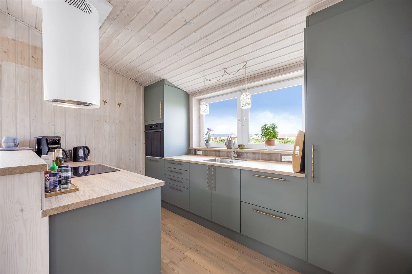 Køkkenet er udstyret med 1 køleskab. Der er 4 keramiske kogeplader, varmluftovn, mikrobølgeovn samt opvaskemaskine.