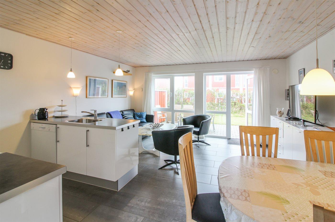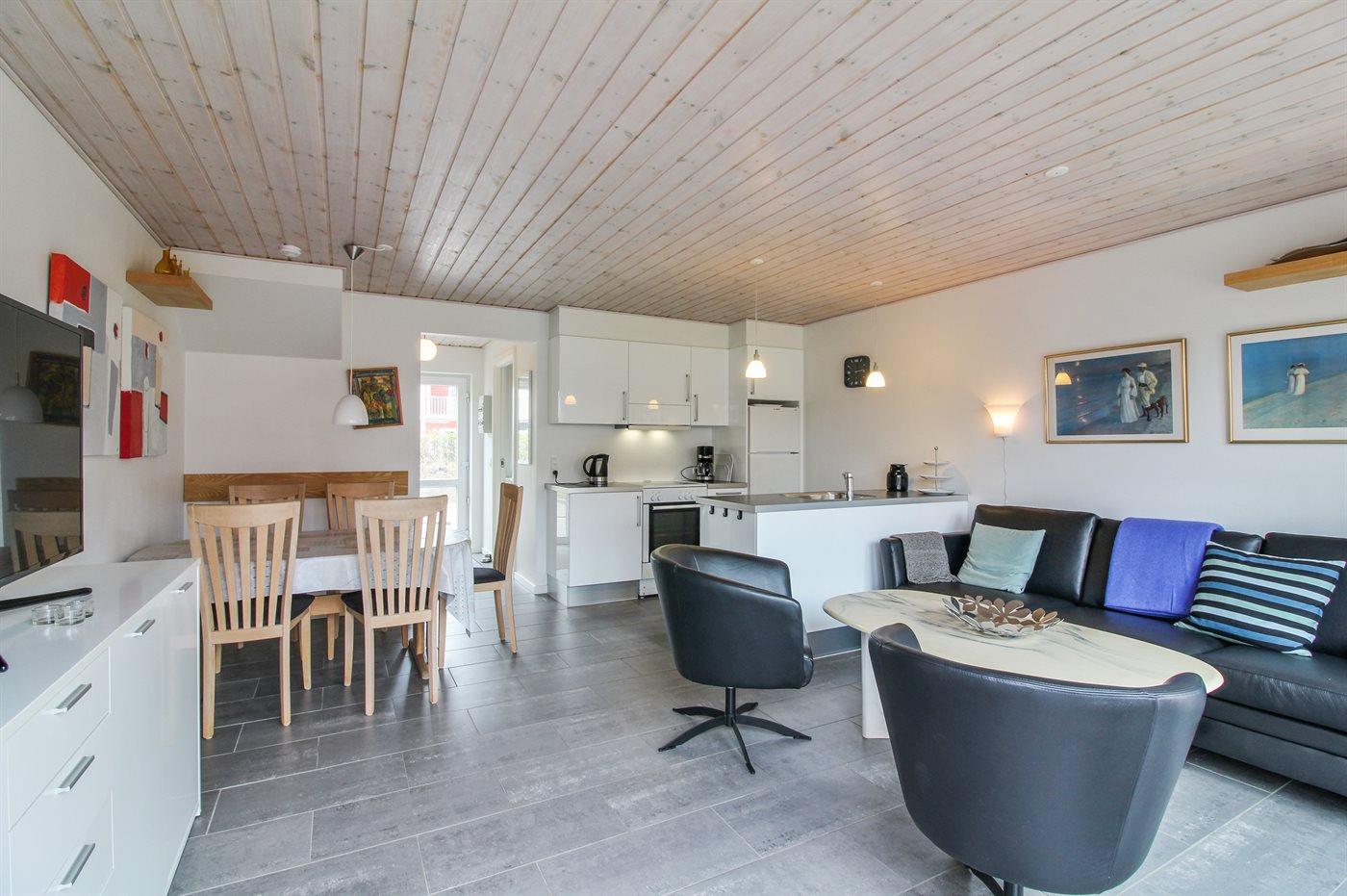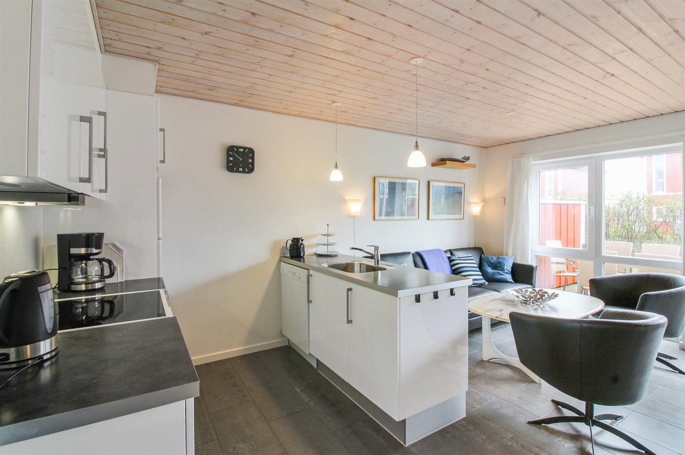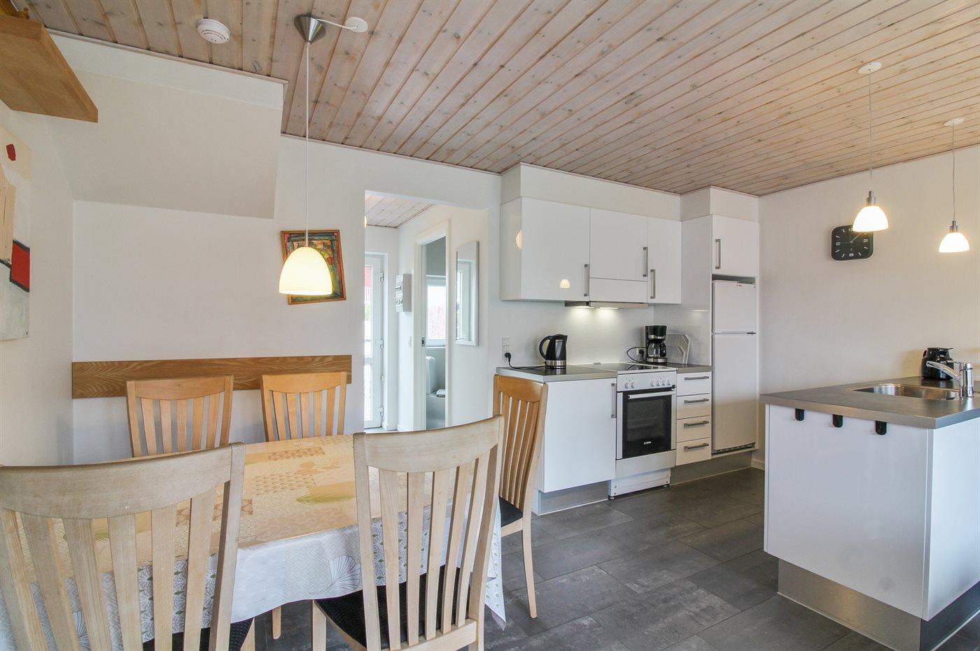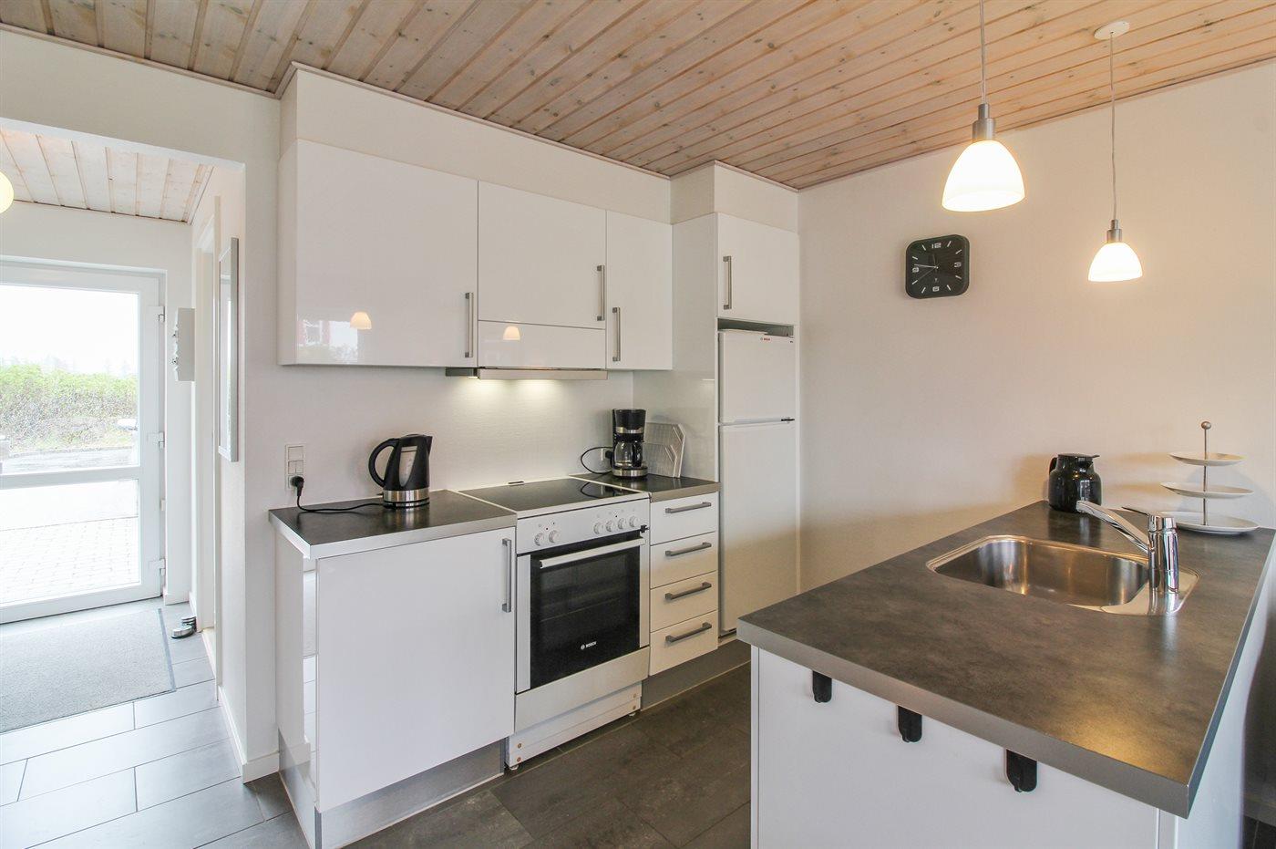 Køkkenet er udstyret med 1 køleskab. Der er 4 keramiske kogeplader, varmluftovn, mikrobølgeovn samt opvaskemaskine.