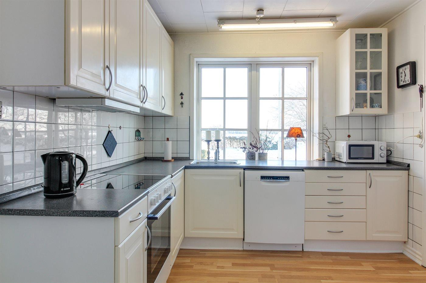Køkkenet er udstyret med 1 køleskab. Der er 4 keramiske kogeplader, bageovn, mikrobølgeovn samt opvaskemaskine.