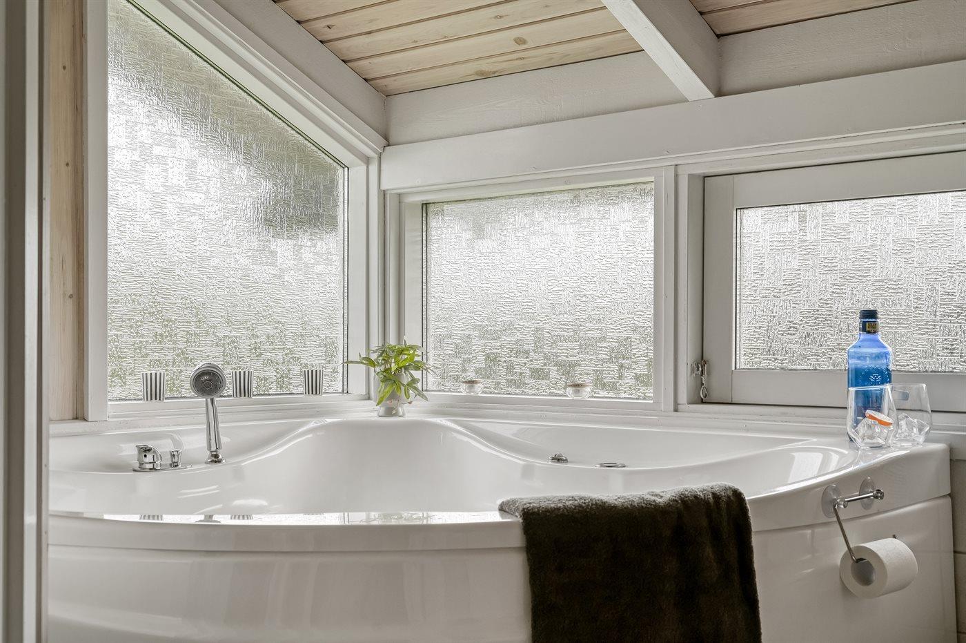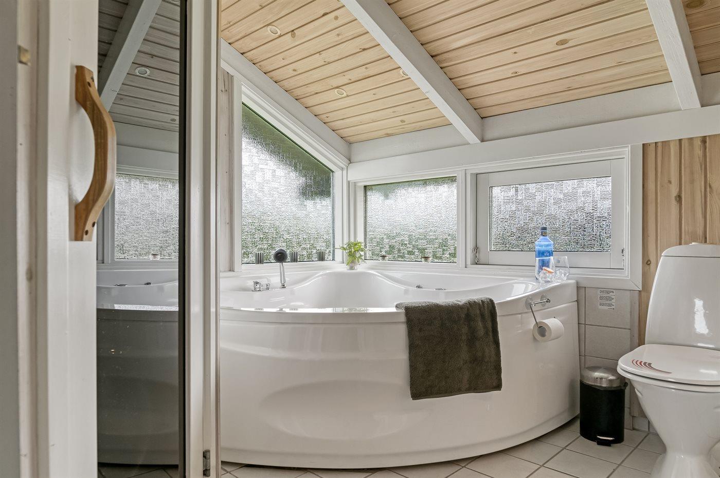 Der er 2 badeværelser med bruseniche og 2 toiletter. Der er gulvvarme på 1 badeværelse. I saunaen er der mulighed for afslapning.