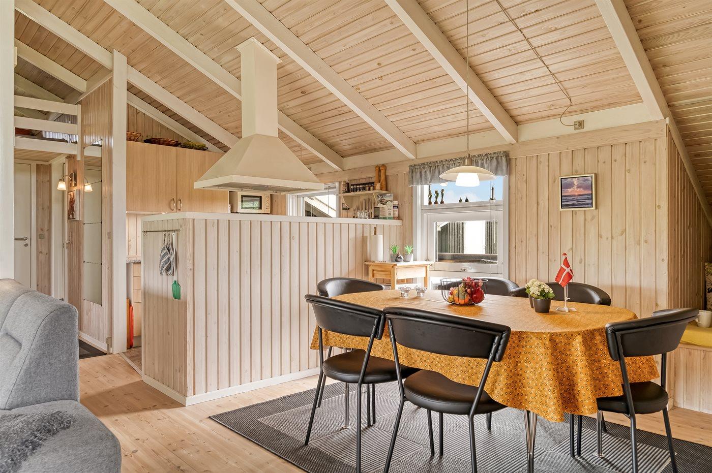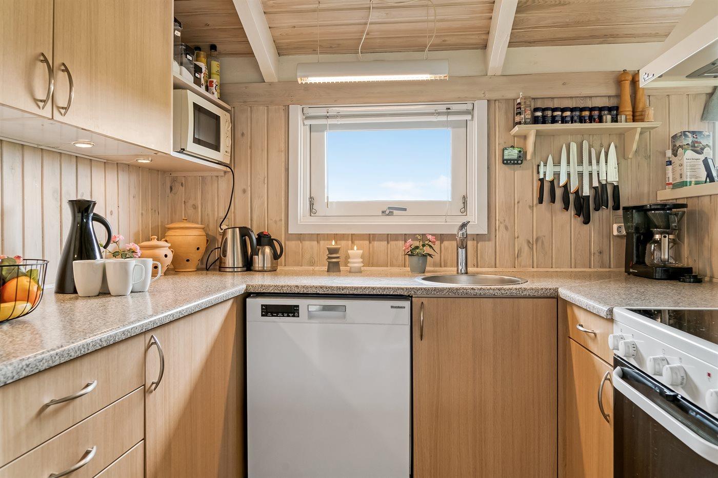 Køkkenet er udstyret med 1 køleskab. Der er 4 keramiske kogeplader, bageovn, mikrobølgeovn samt opvaskemaskine.