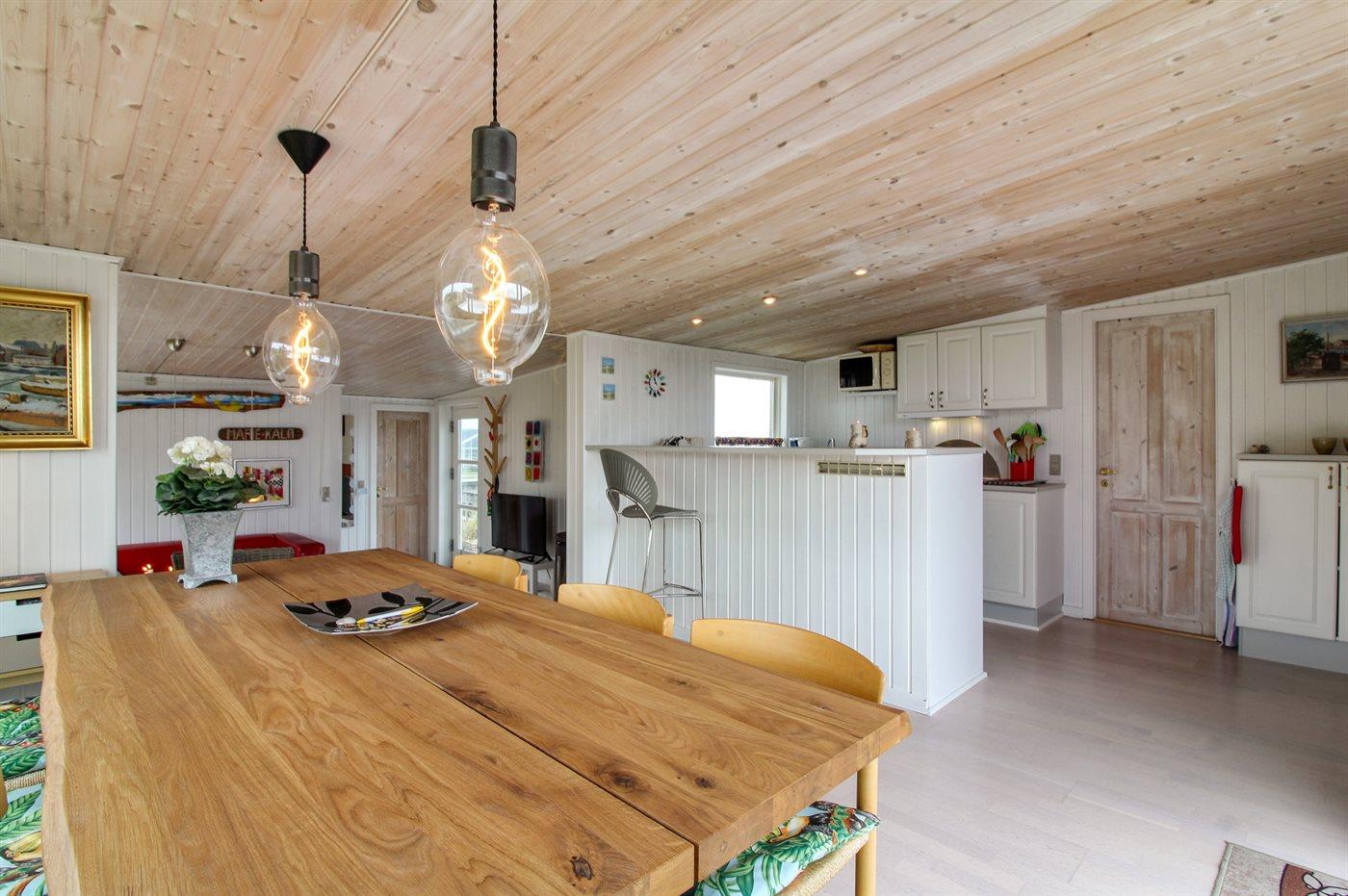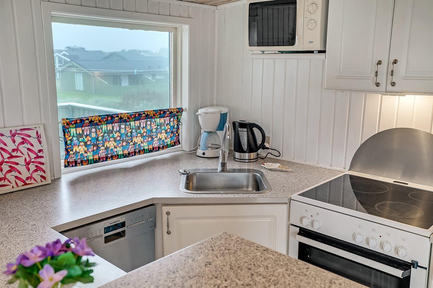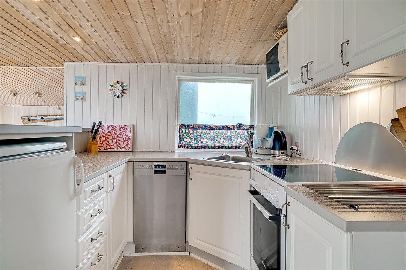 Køkkenet er udstyret med 1 køleskab. Der er 4 keramiske kogeplader, varmluftovn, mikrobølgeovn samt opvaskemaskine.