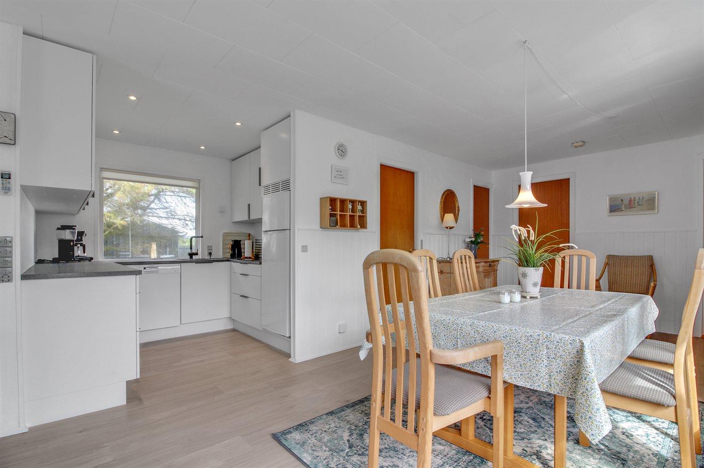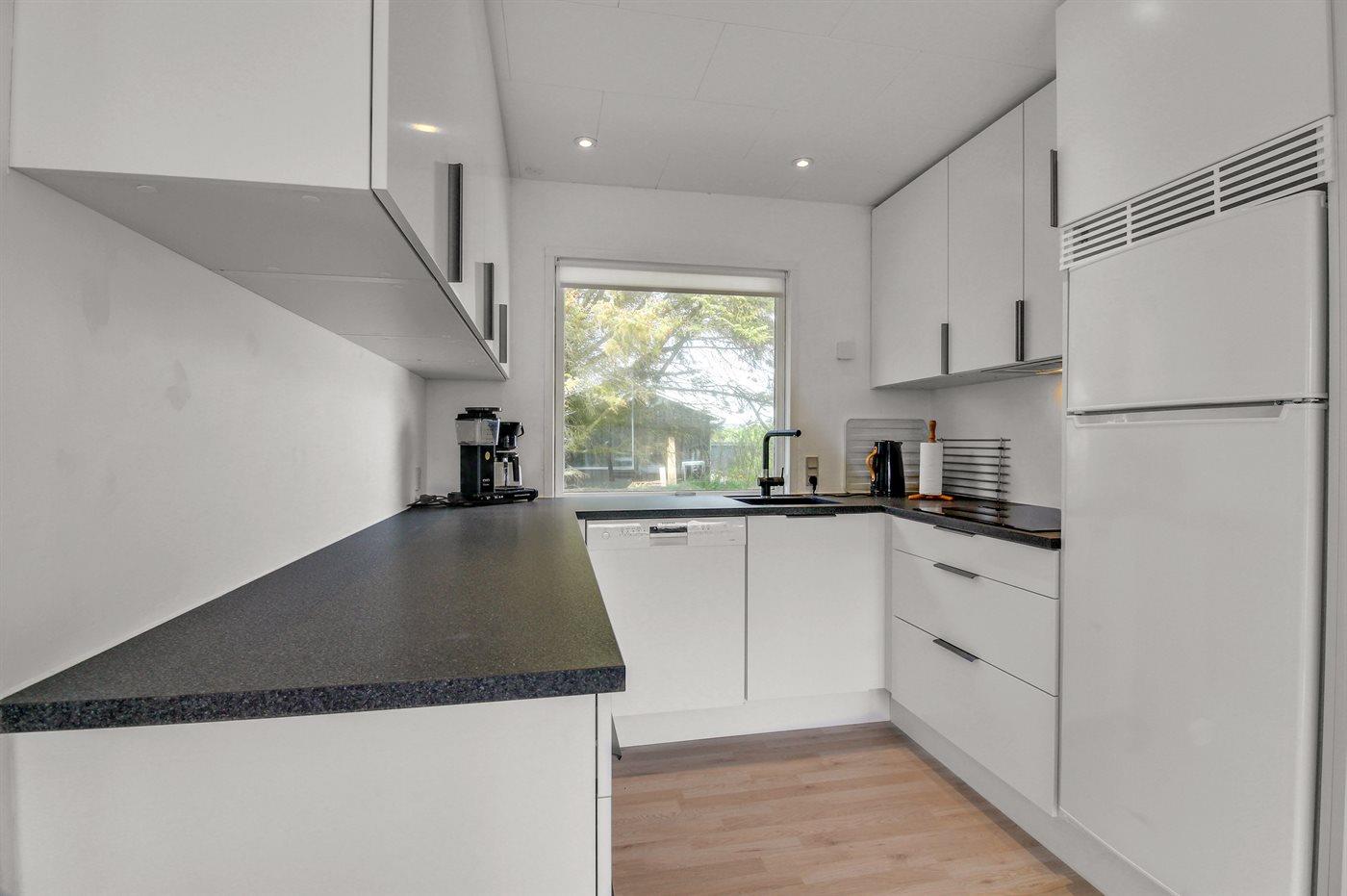 Køkkenet er udstyret med 1 køleskab. Der er 4 keramiske kogeplader, bageovn, mikrobølgeovn samt opvaskemaskine.