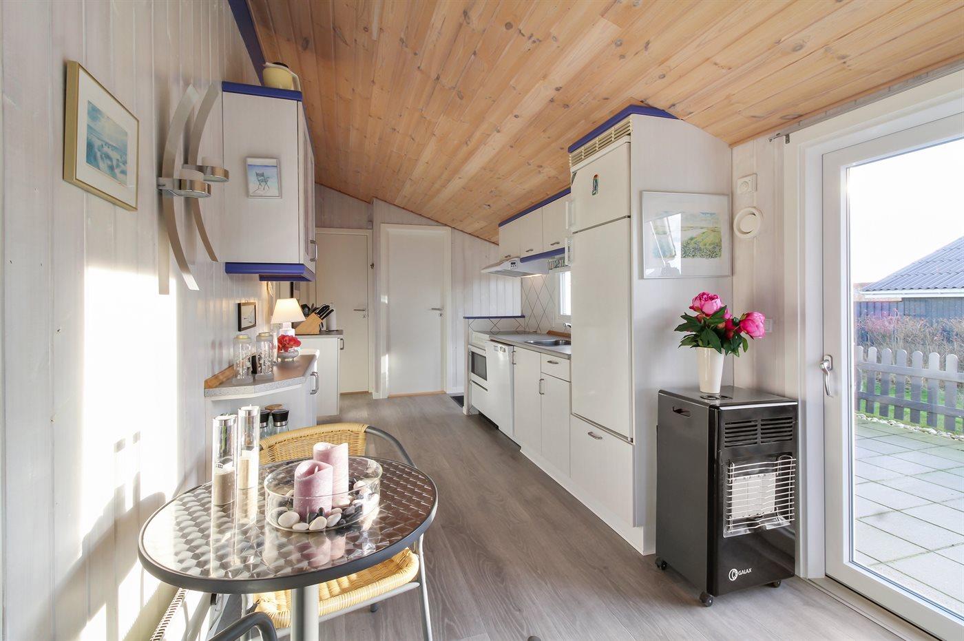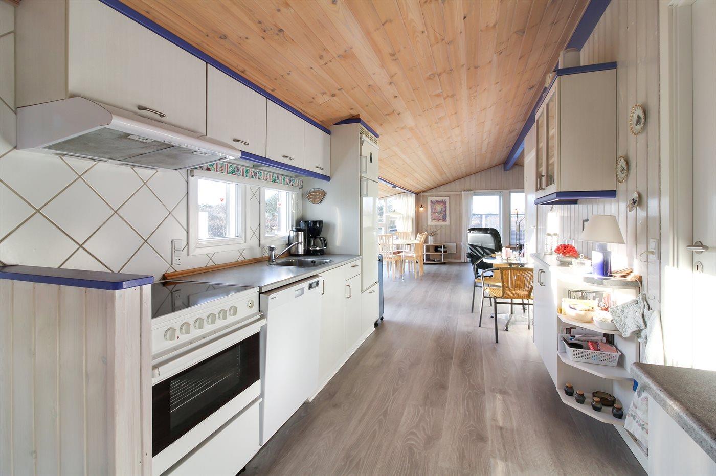 Køkkenet er udstyret med 1 køleskab. Der er 4 keramiske kogeplader, varmluftovn, mikrobølgeovn samt opvaskemaskine.