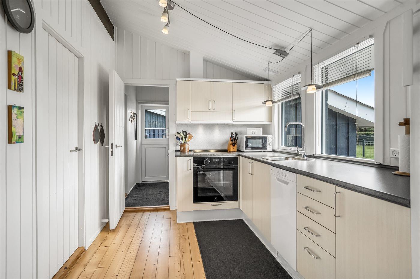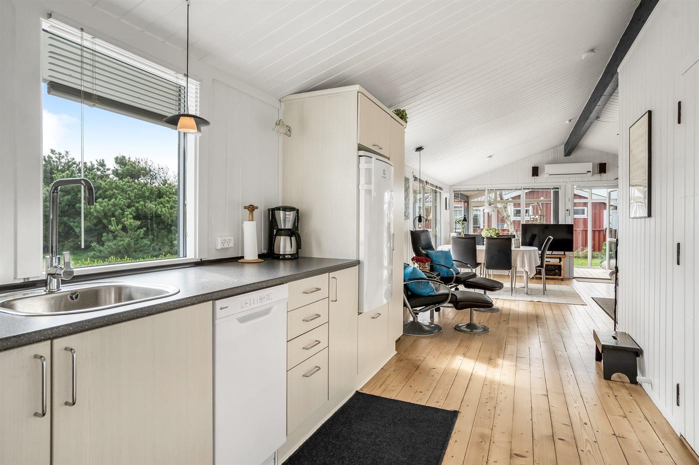 Køkkenet er udstyret med 1 køleskab. Der er 4 keramiske kogeplader, varmluftovn, mikrobølgeovn samt opvaskemaskine.