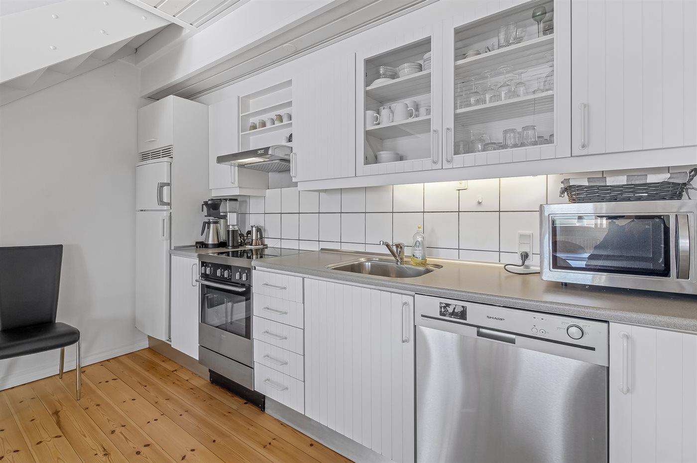 Køkkenet er udstyret med 1 køleskab. Der er 4 keramiske kogeplader, varmluftovn, mikrobølgeovn samt opvaskemaskine.