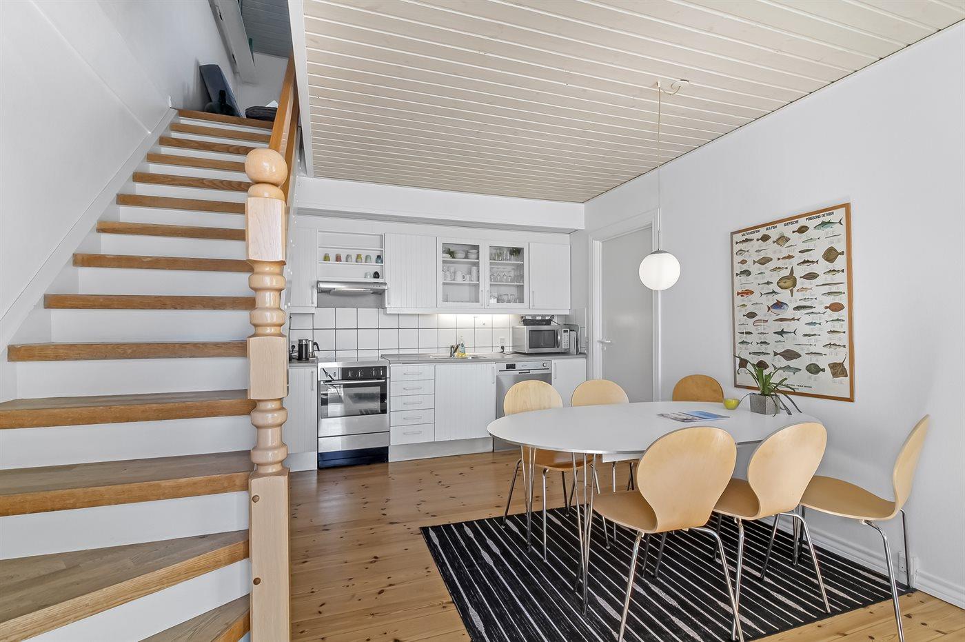 Lejligheden ligger på 1. sal og er i 2 plan, hvilket gør den perfekt til ferien for 2-3 par eller familier med større børn.