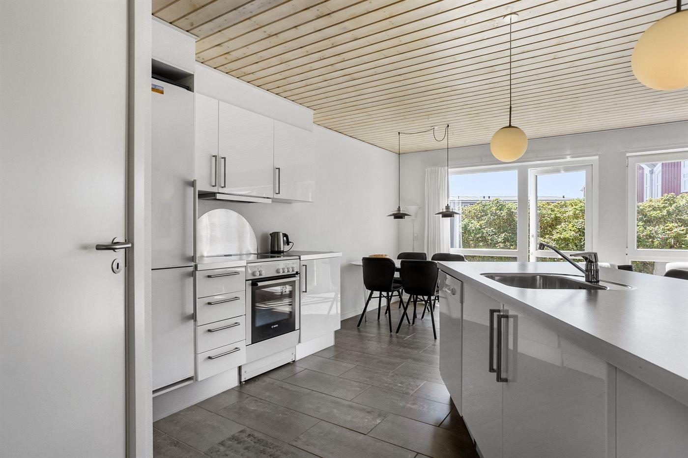 Køkkenet er udstyret med 1 køleskab. Der er 4 keramiske kogeplader, varmluftovn samt opvaskemaskine.
