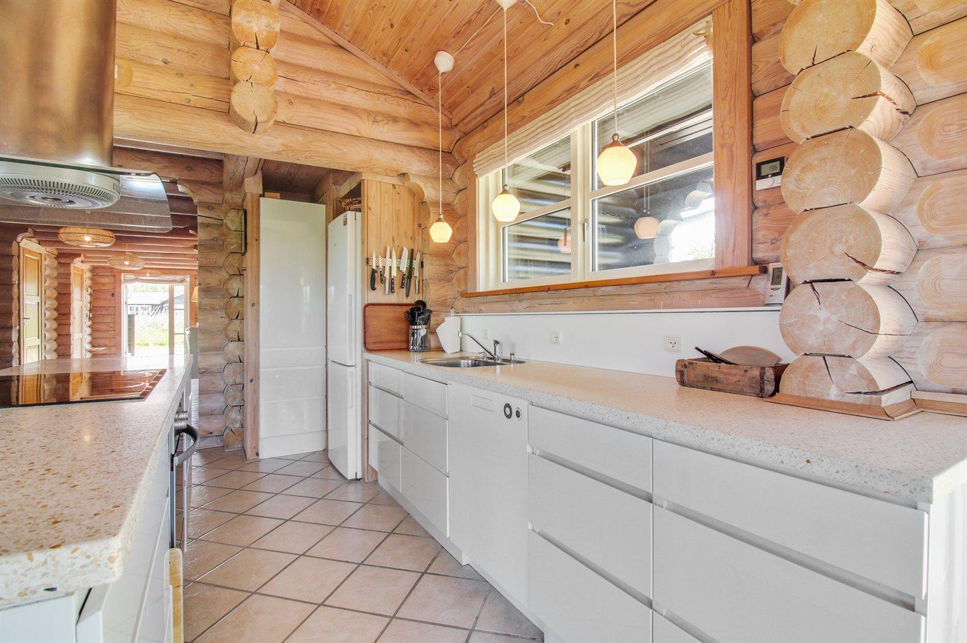 Køkkenet er udstyret med 1 køleskab. Der er 4 keramiske kogeplader, varmluftovn, mikrobølgeovn samt opvaskemaskine Der er gulvvarme i køkkenet.