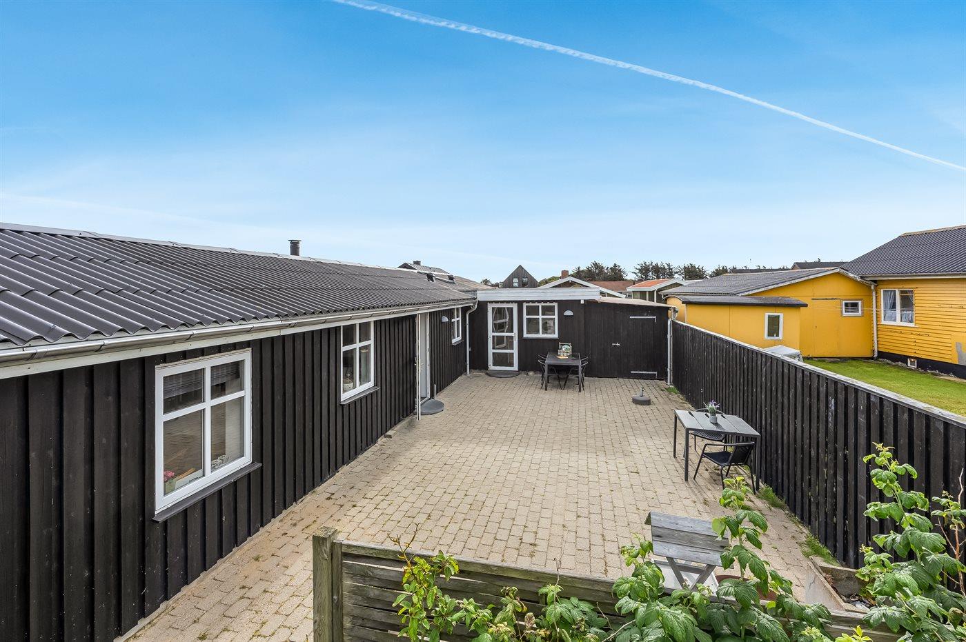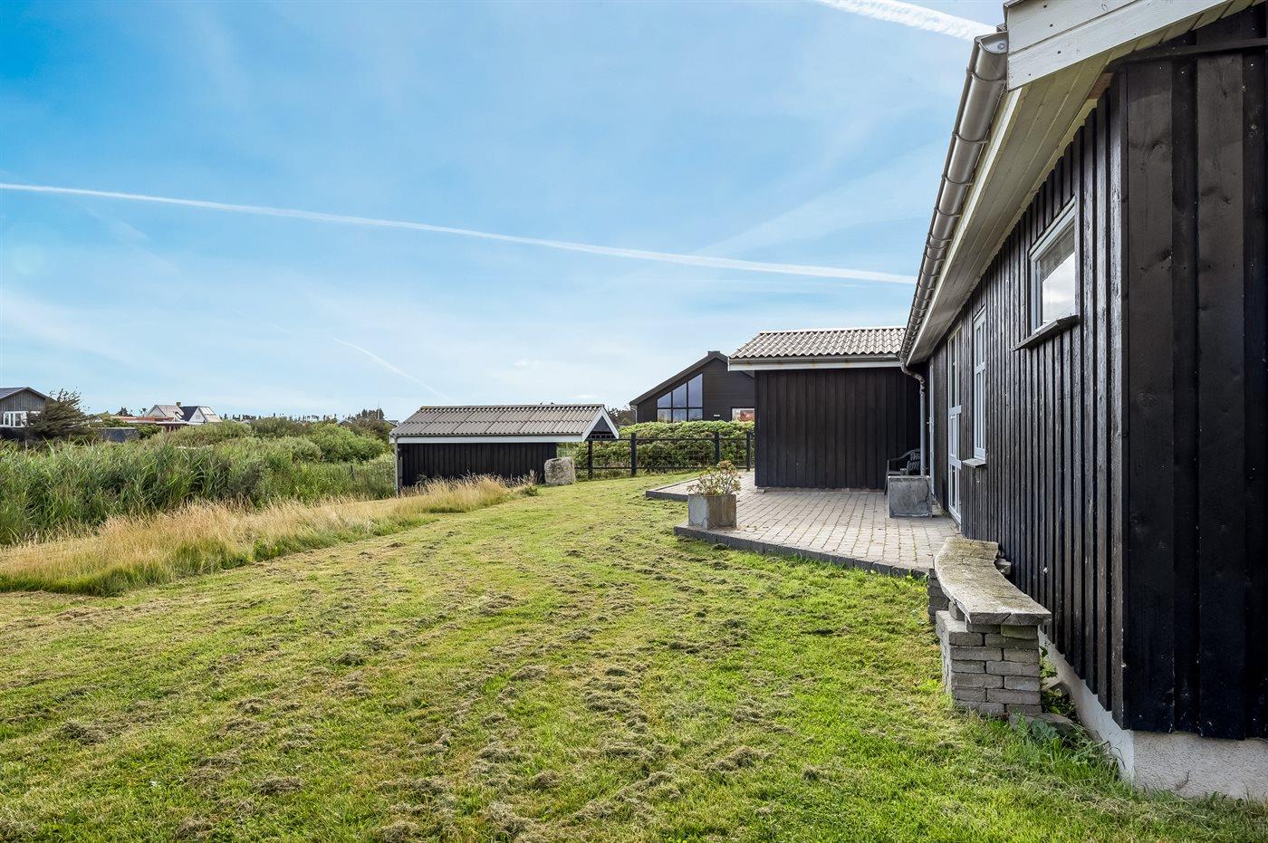 Ferieboligen er beliggende på en 870 m² stor naturgrund. Grunden er indhegnet. Der er 450 m til havet. Nærmeste forretning er beliggende i en afstand af 500 m. Til ferieboligen hører 86 m² terrasseareal. Udgang til solgård. Der er redskabsrum. Grill til rådighed. Der er carport til rådighed. Parkering ved ferieboligen.