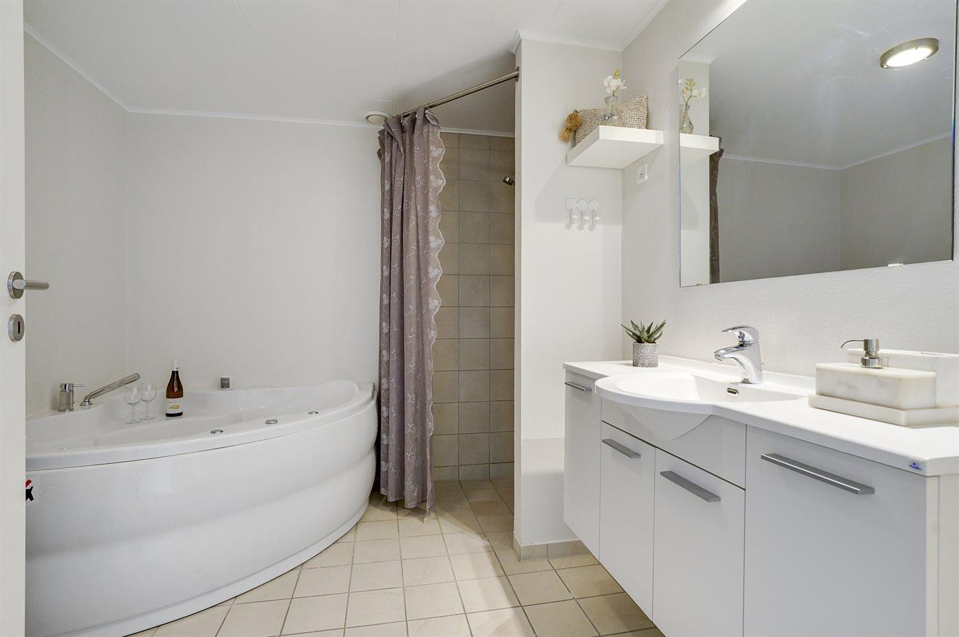 Der er 2 badeværelser med bruseniche og 2 toiletter. Der er gulvvarme på 1 badeværelse.