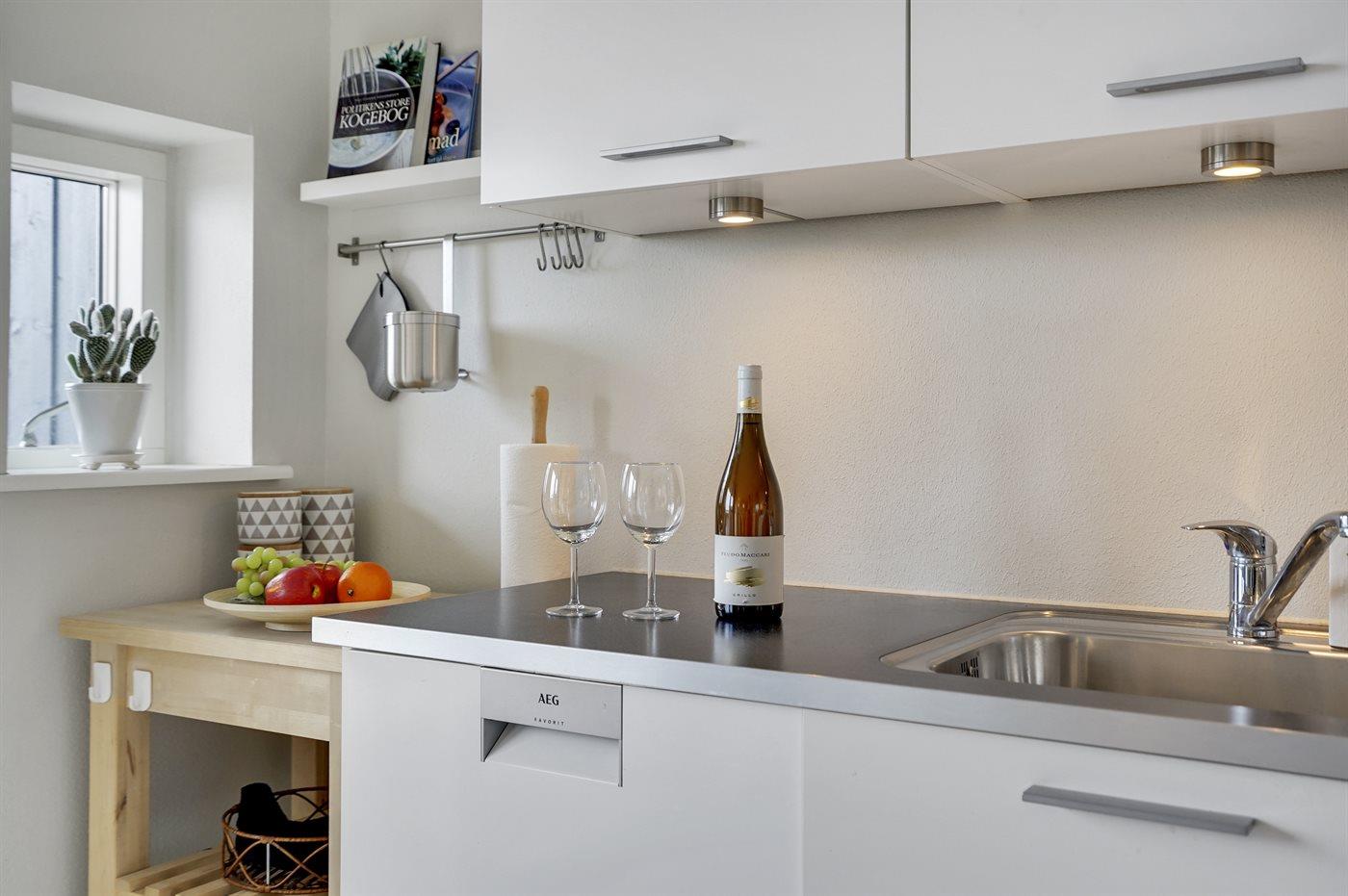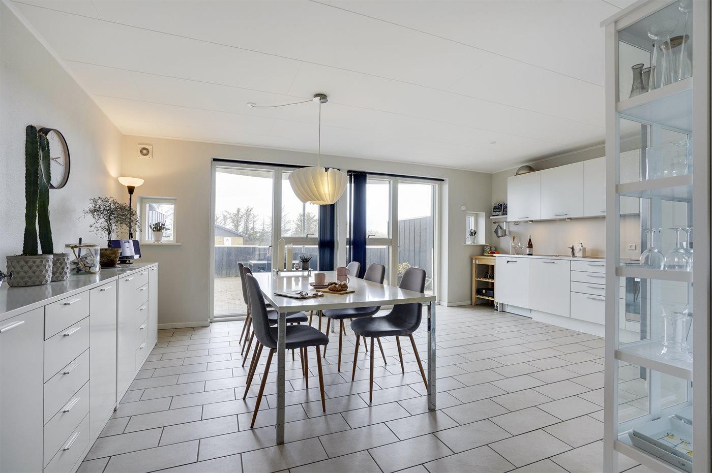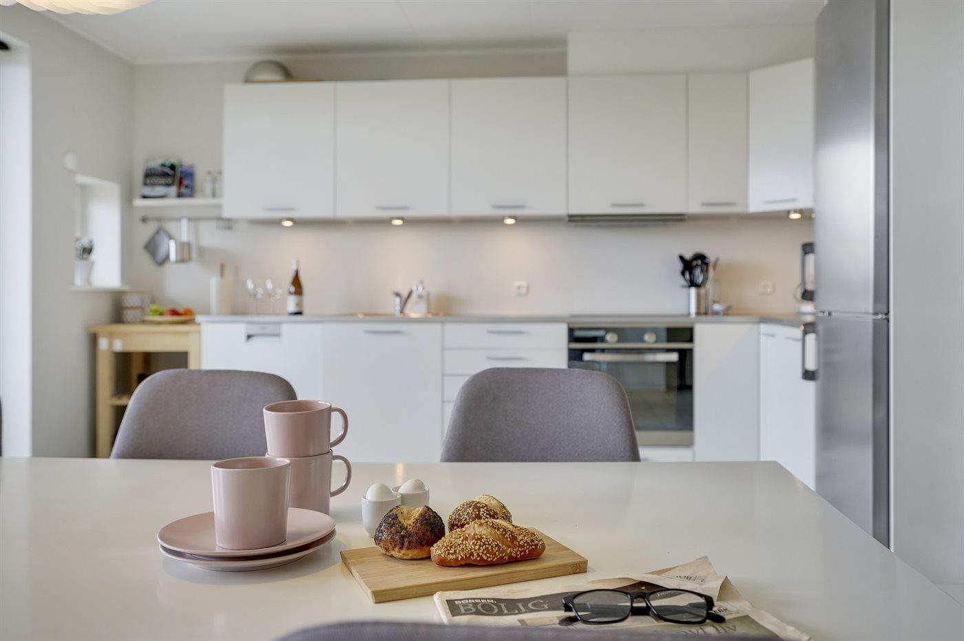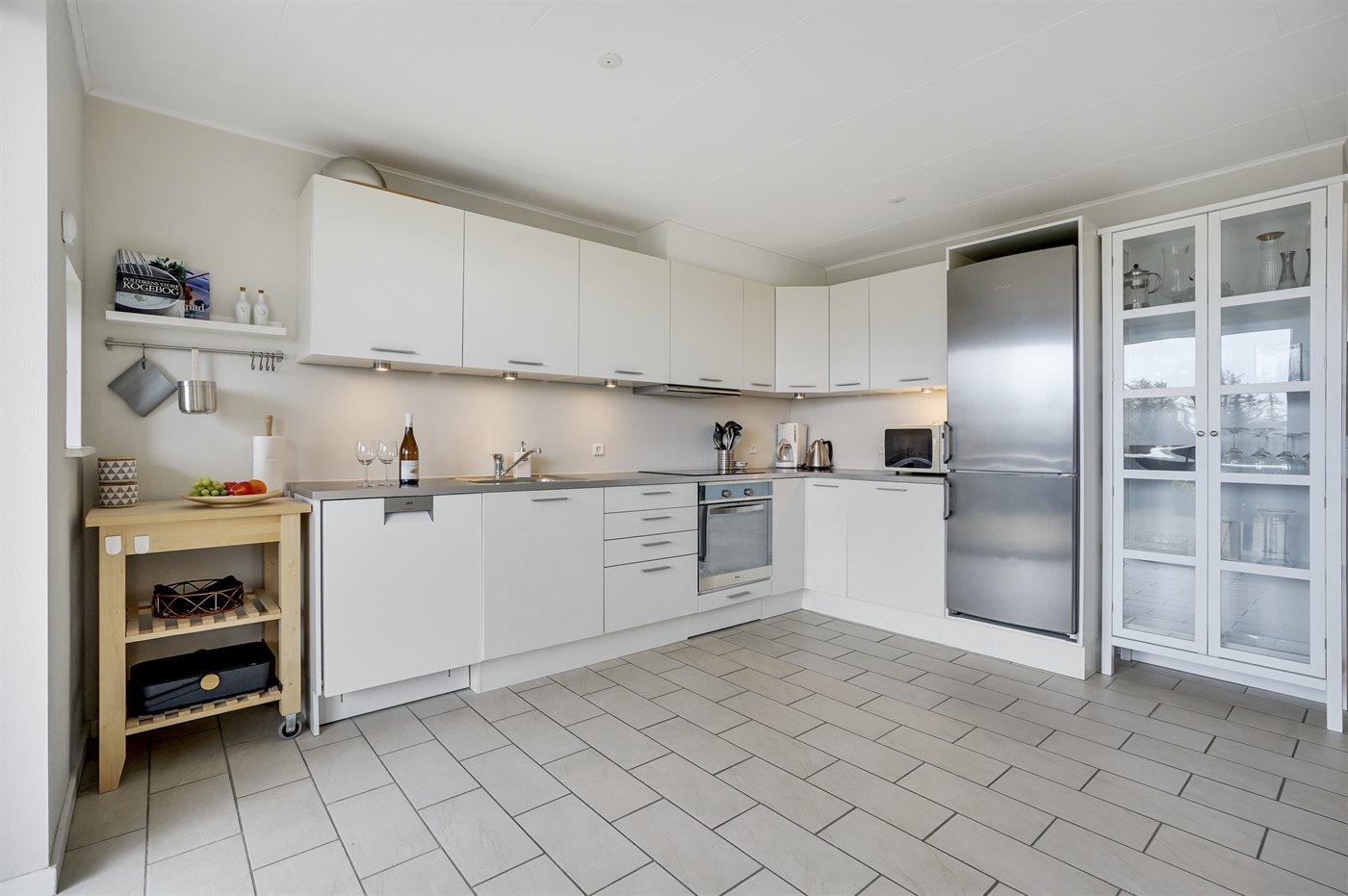 Køkkenet er udstyret med 1 køleskab. Der er 4 keramiske kogeplader, varmluftovn, mikrobølgeovn samt opvaskemaskine Der er gulvvarme i køkkenet.