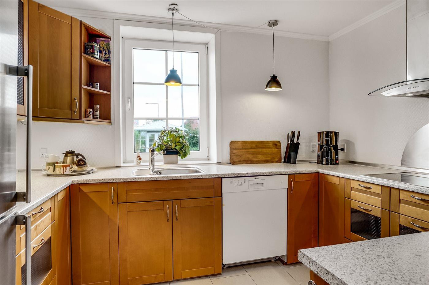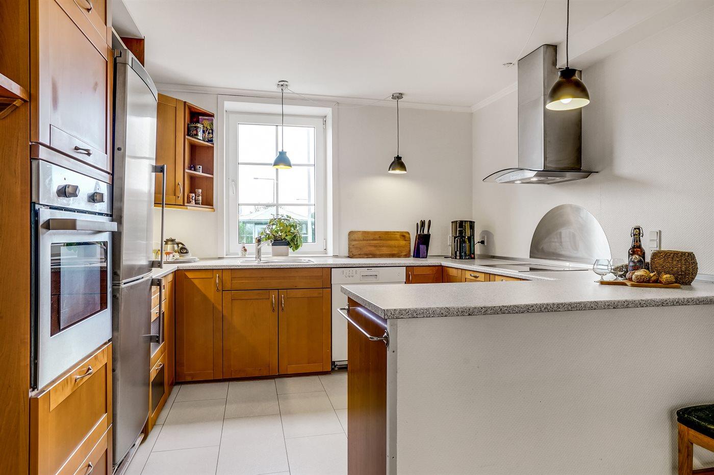 Køkkenet er udstyret med 1 køleskab. Der er 4 keramiske kogeplader, varmluftovn, mikrobølgeovn samt opvaskemaskine.
