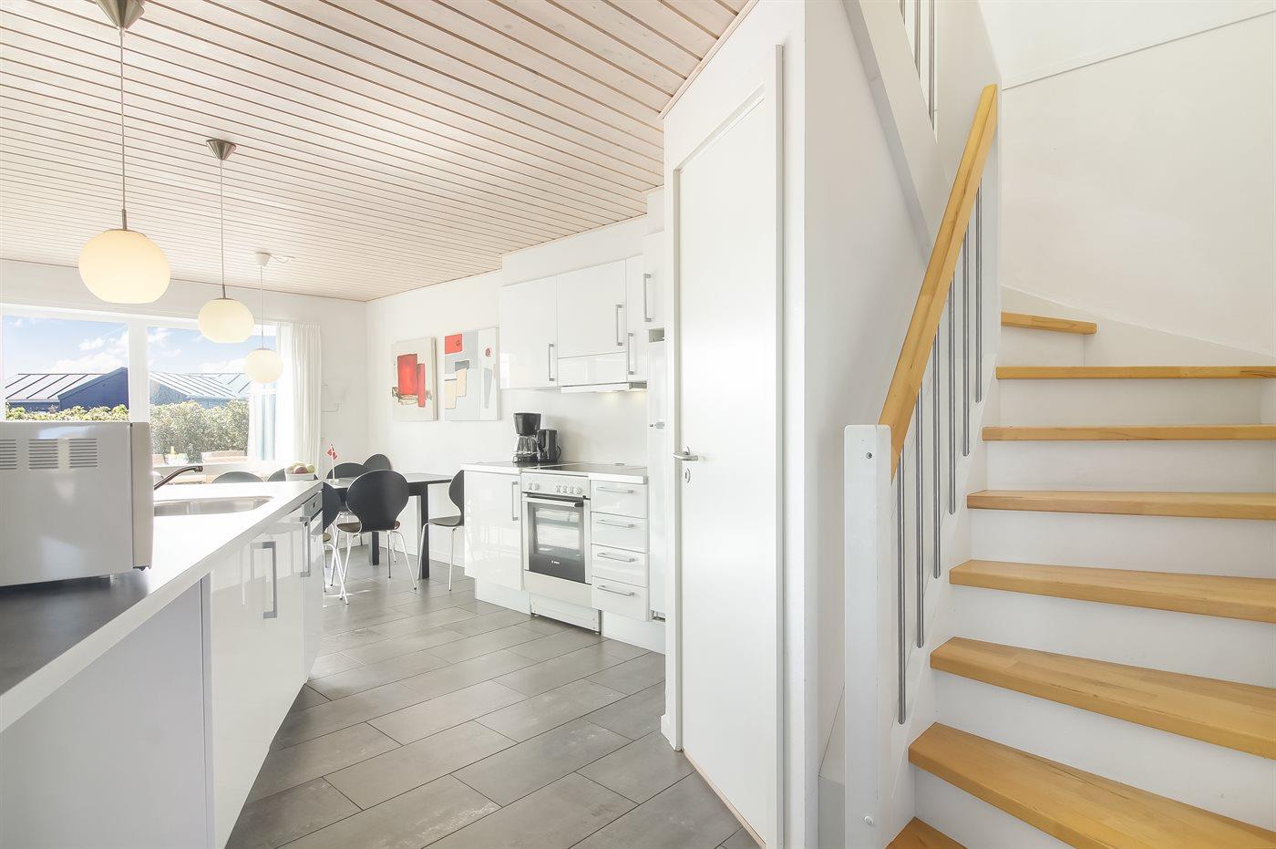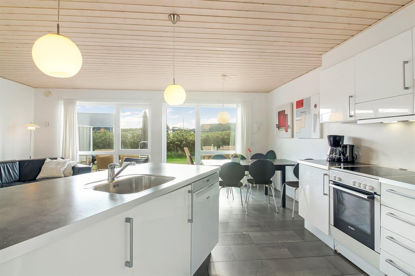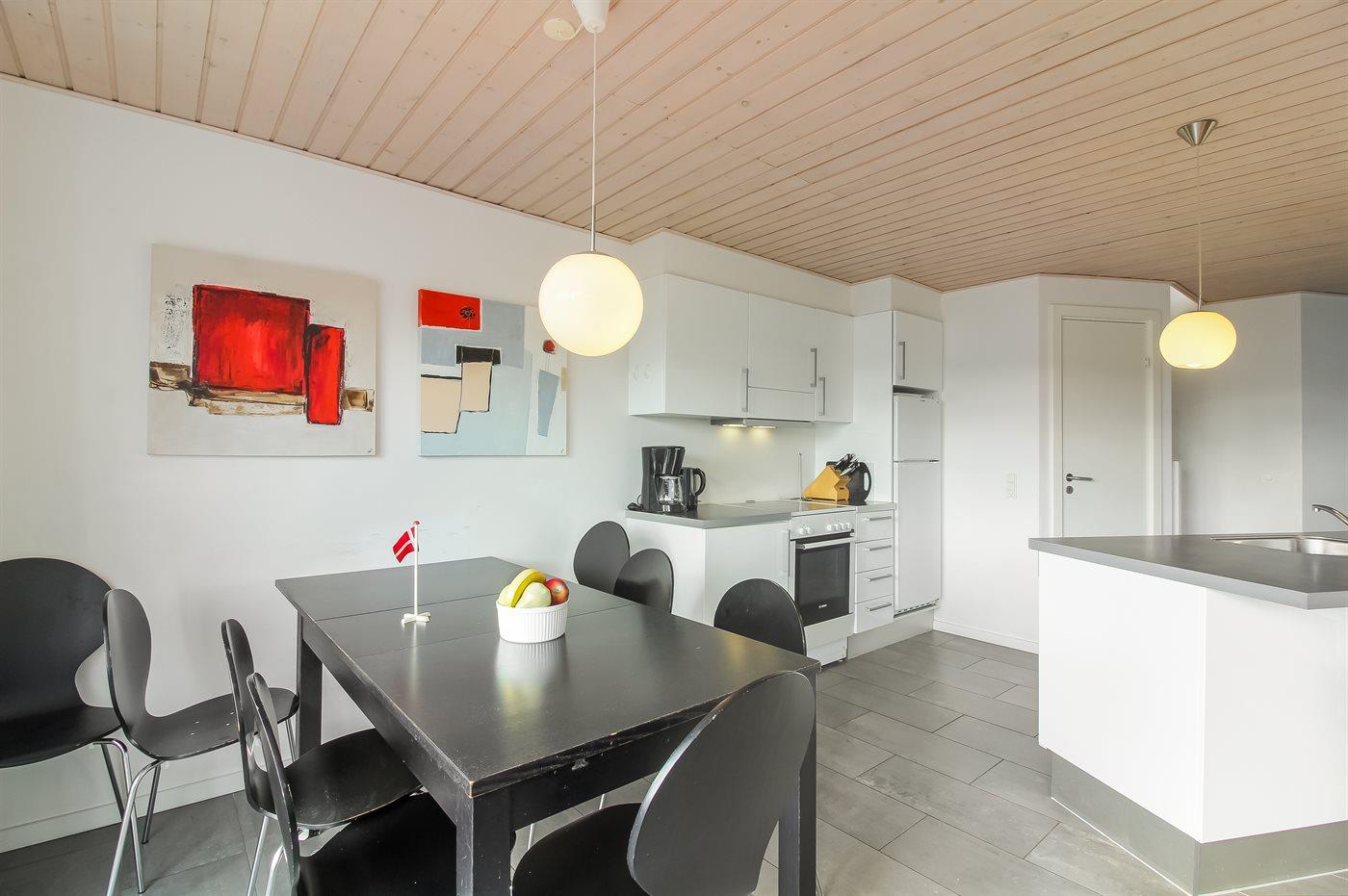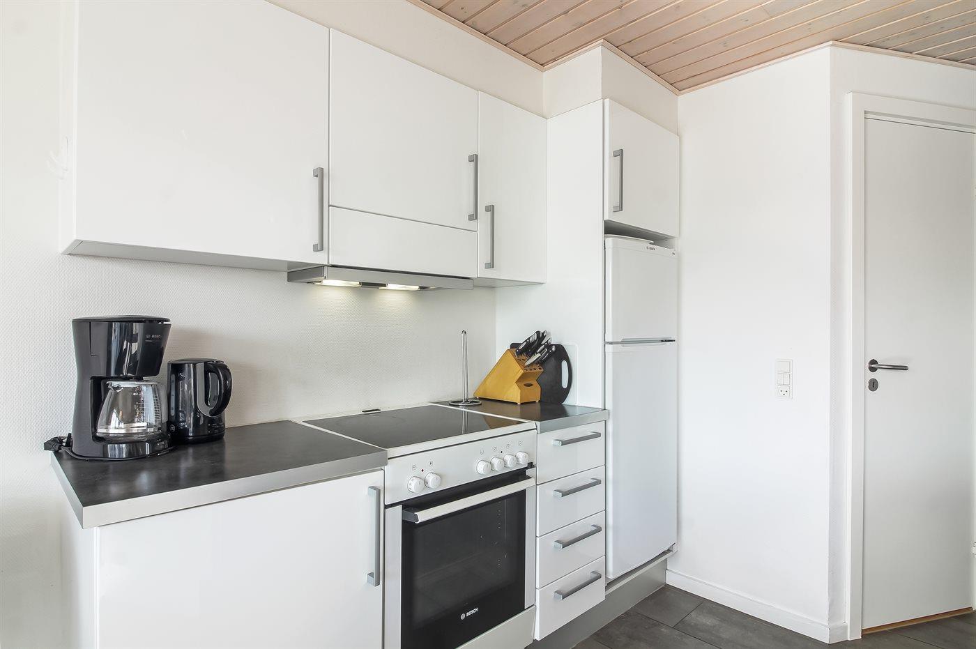 Køkkenet er udstyret med 1 køleskab. Der er 4 keramiske kogeplader, varmluftovn, mikrobølgeovn samt opvaskemaskine.