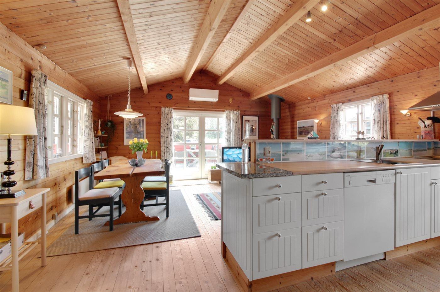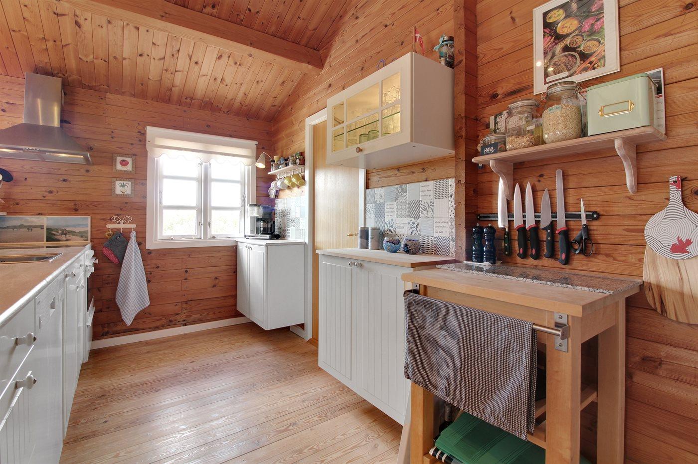 Køkkenet er udstyret med 1 køleskab. Der er 4 keramiske kogeplader, bageovn samt opvaskemaskine.