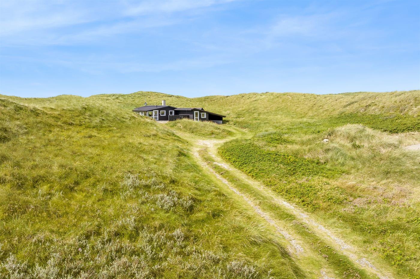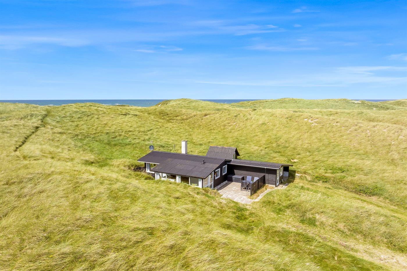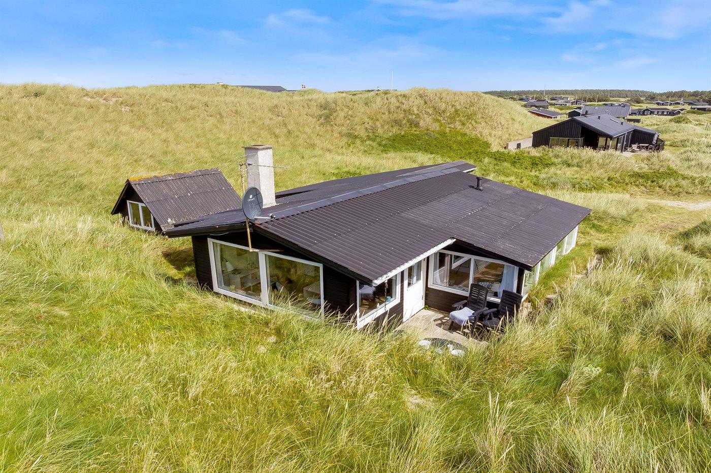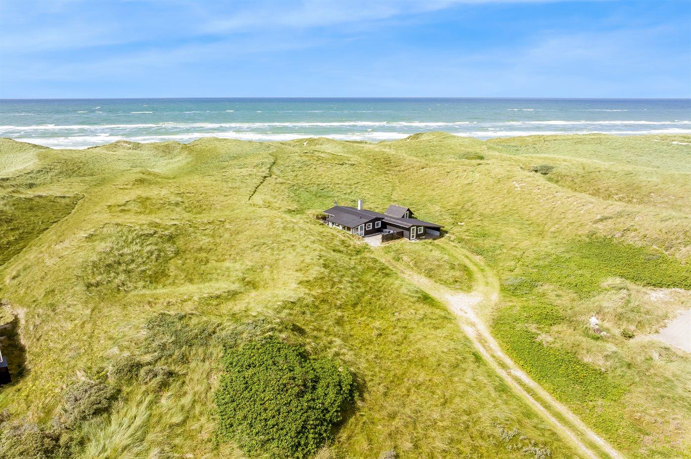 Helt ude i klitterne ligger dette smukke sommerhus med egen sti, der fører direkte til stranden. Her får man følelsen af at sidde direkte i klitterne, med og uden sand mellem tæerne. Her er der virkelig tale om at ligge i første klitrække og man kan nyde de smukke Løkken-solnedgange med havudsigt fra grunden.