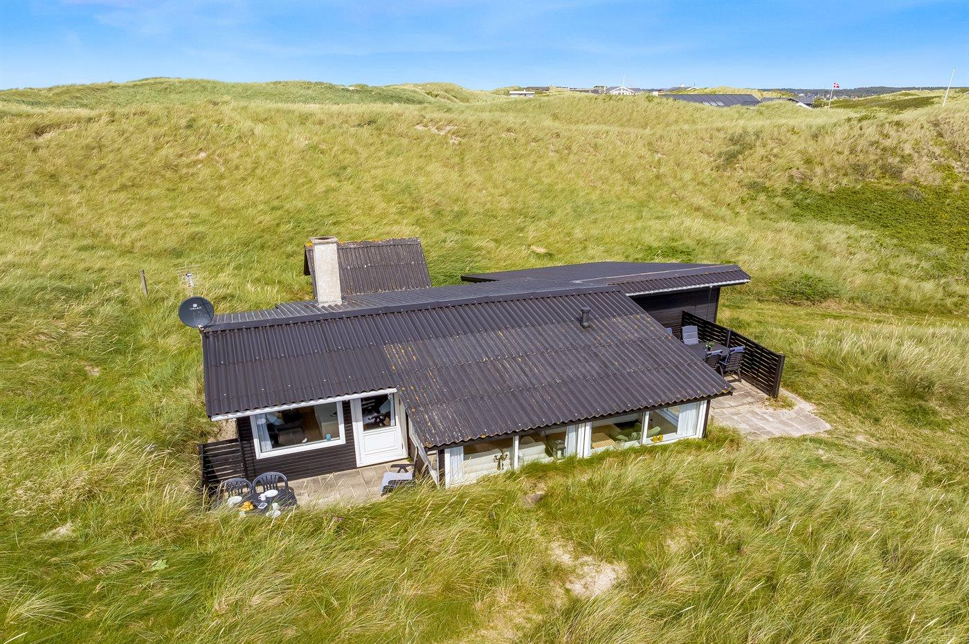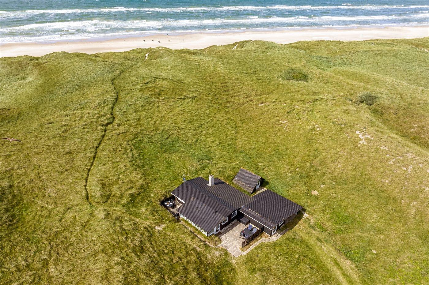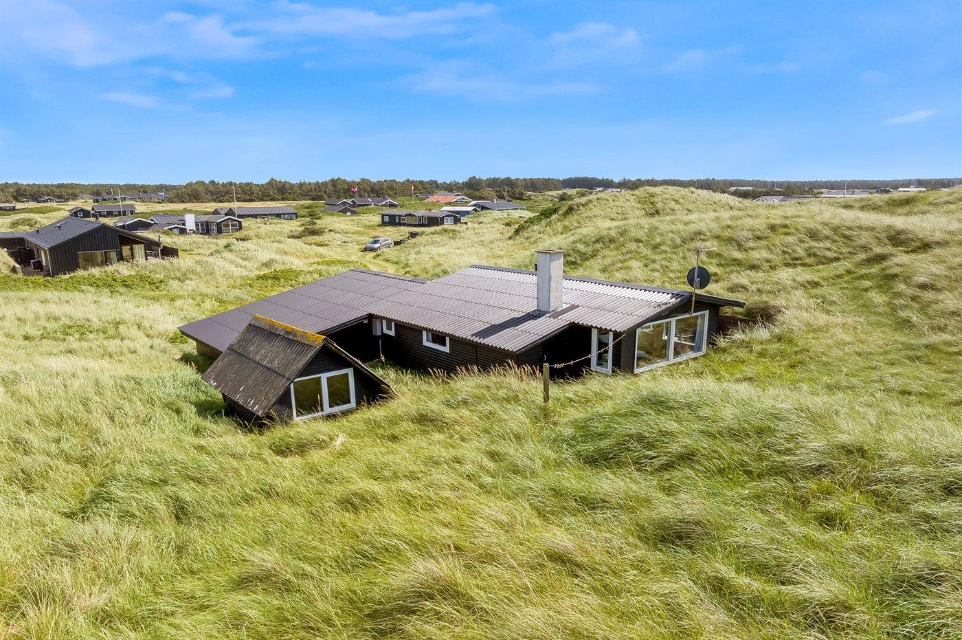 Helt ude i klitterne ligger dette smukke sommerhus med egen sti, der fører direkte til stranden. Her får man følelsen af at sidde direkte i klitterne, med og uden sand mellem tæerne. Her er der virkelig tale om at ligge i første klitrække og man kan nyde de smukke Løkken-solnedgange med havudsigt fra grunden.