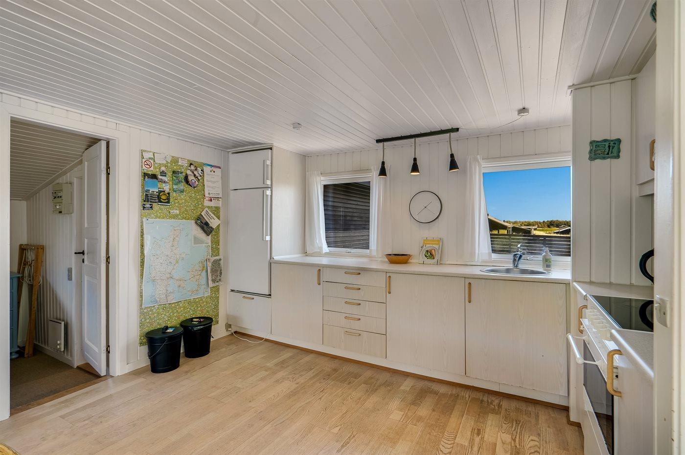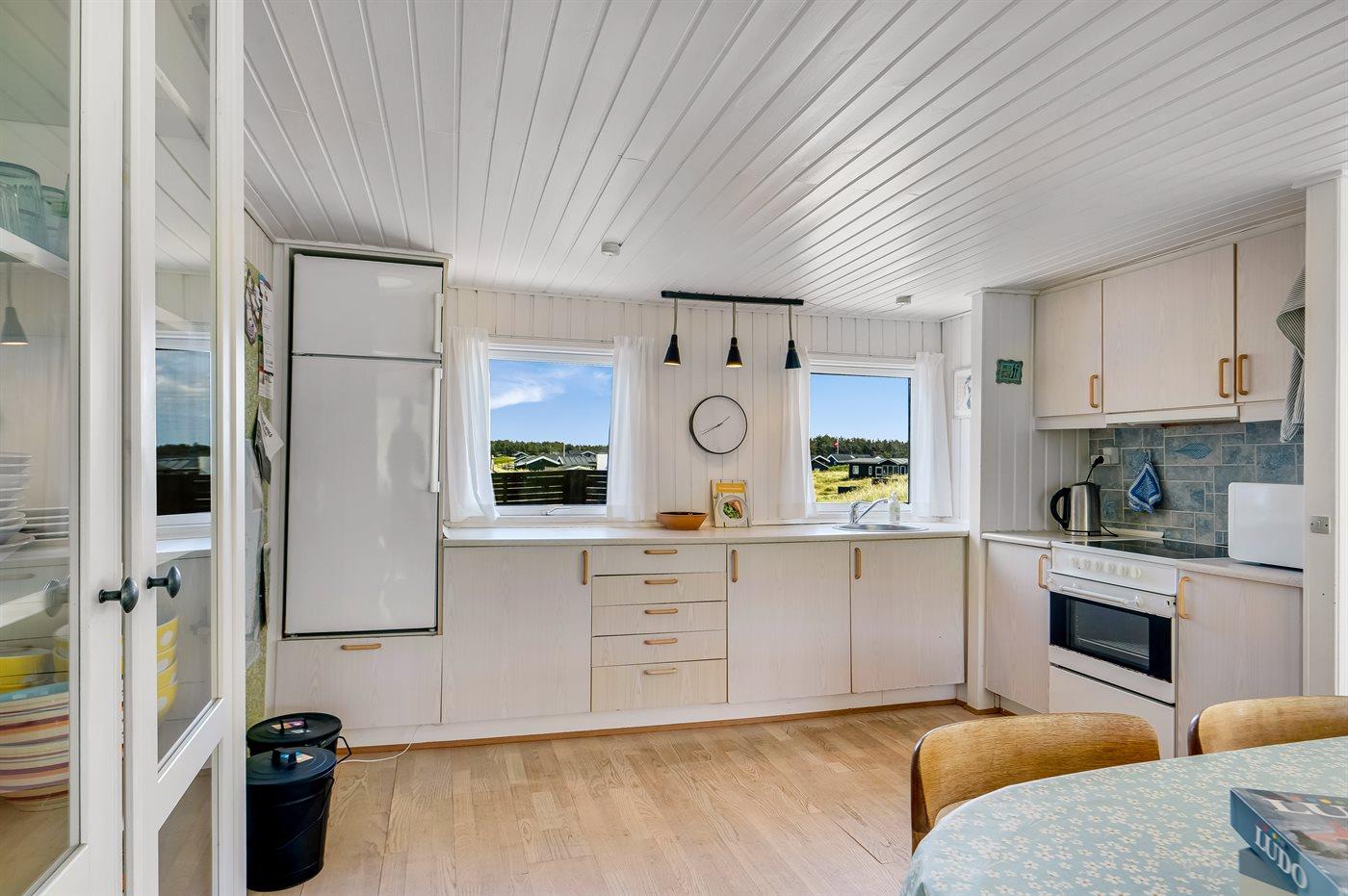 Køkkenet er udstyret med 1 køleskab. Der er 4 keramiske kogeplader, varmluftovn, mikrobølgeovn.