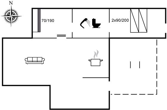 Huset er indrettet således, at der er gennemgang fra det lille soveværelse til badeværelset og derfra videre til det store soveværelse. Huset er i flere niveauer, og der er et enkelt trin ned i både stue og brusekabine.