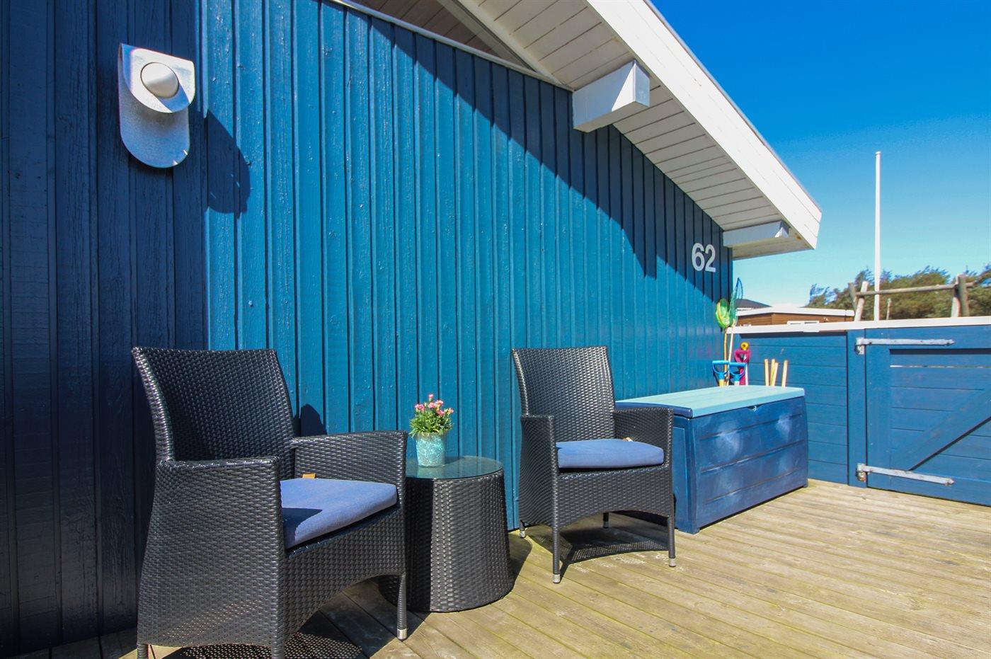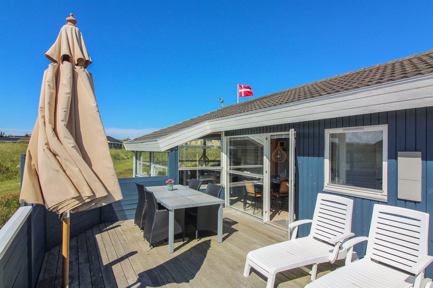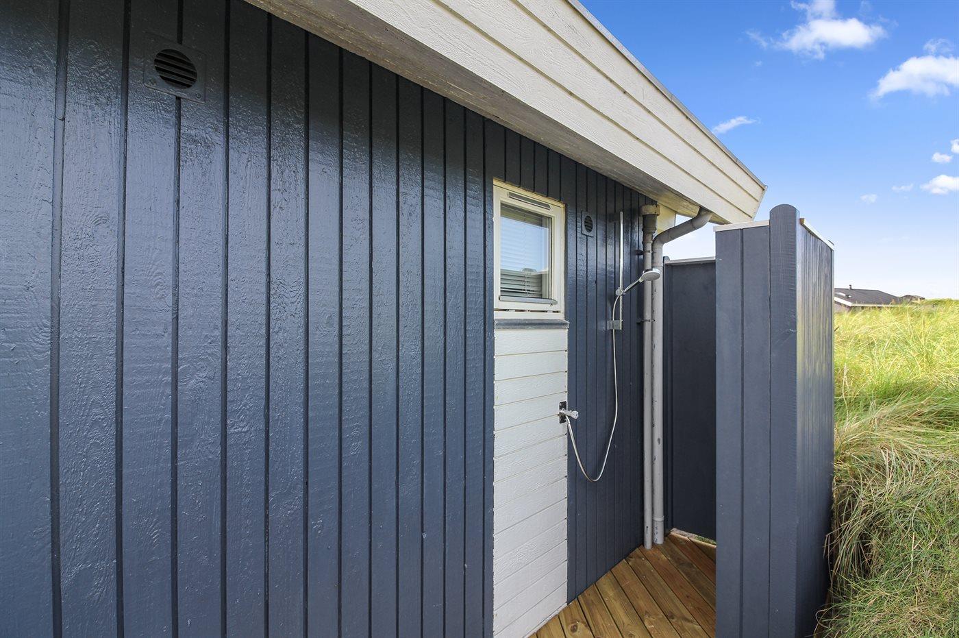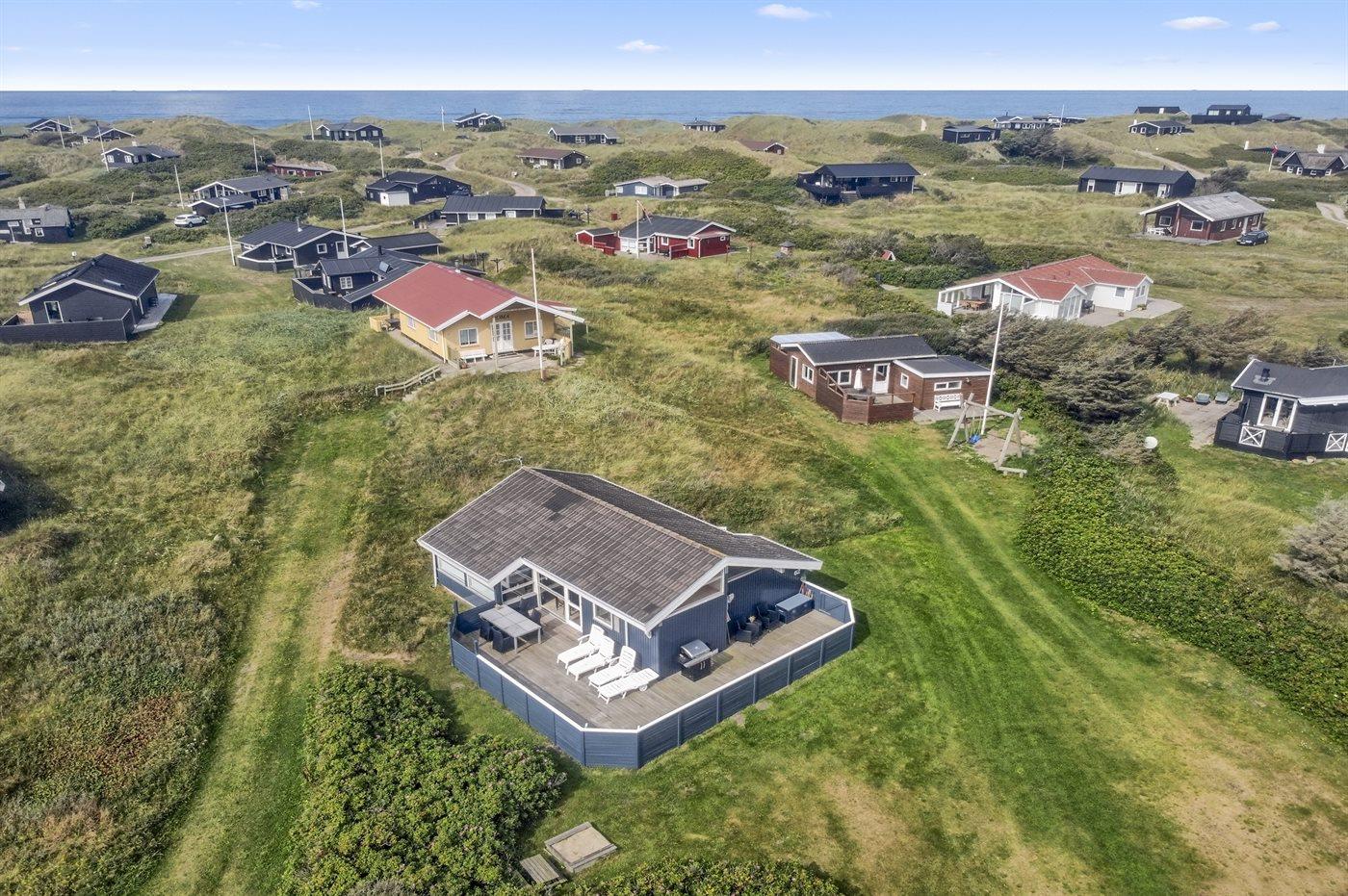 Ferieboligen er beliggende på en 800 m² stor naturgrund. Der er 300 m til havet. Nærmeste forretning er beliggende i en afstand af 2500 m. Til ferieboligen hører 50 m² terrasseareal. Heraf i alt 45 m² lukket terrasse. Der er redskabsrum. Sandkasse. Parkering ved ferieboligen.