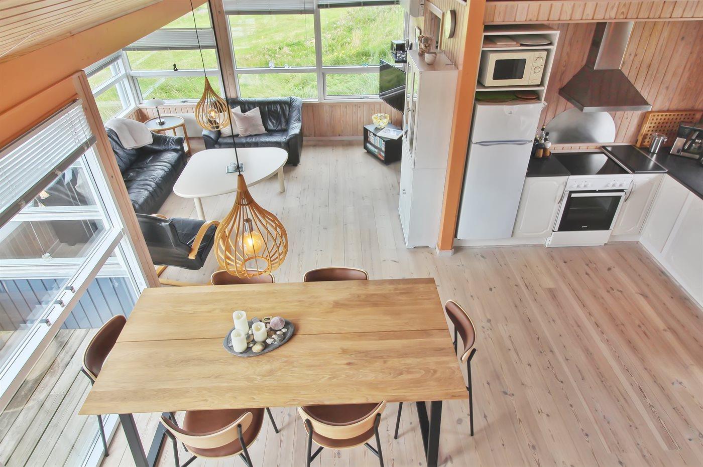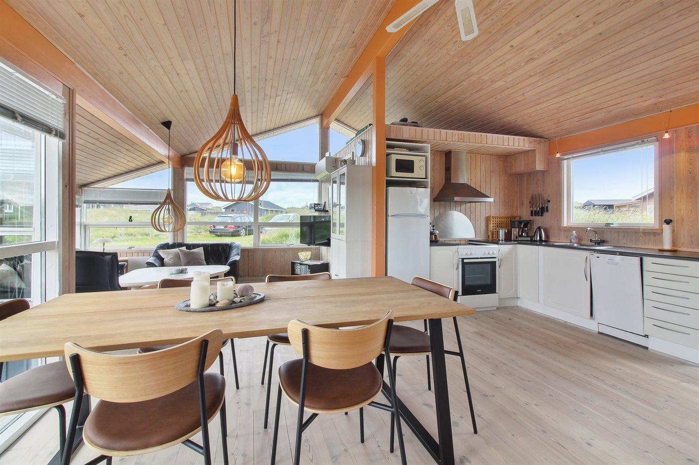 Køkkenet er udstyret med 1 køleskab. Der er 4 keramiske kogeplader, varmluftovn, mikrobølgeovn samt opvaskemaskine.