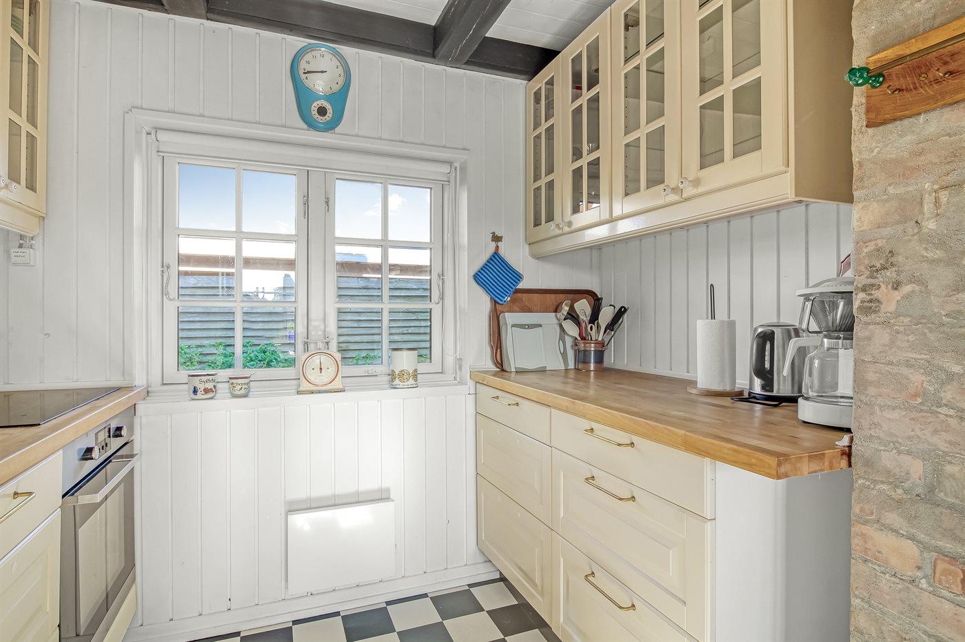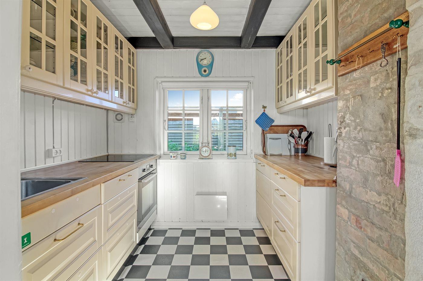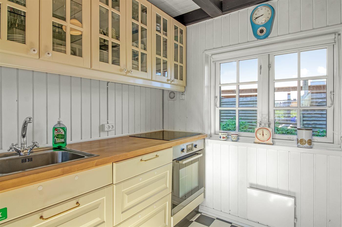 Køkkenet er udstyret med 1 køleskab. Der er 4 induktionskogeplader, varmluftovn samt opvaskemaskine.