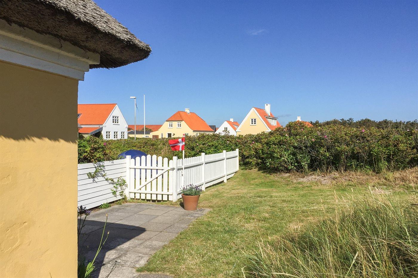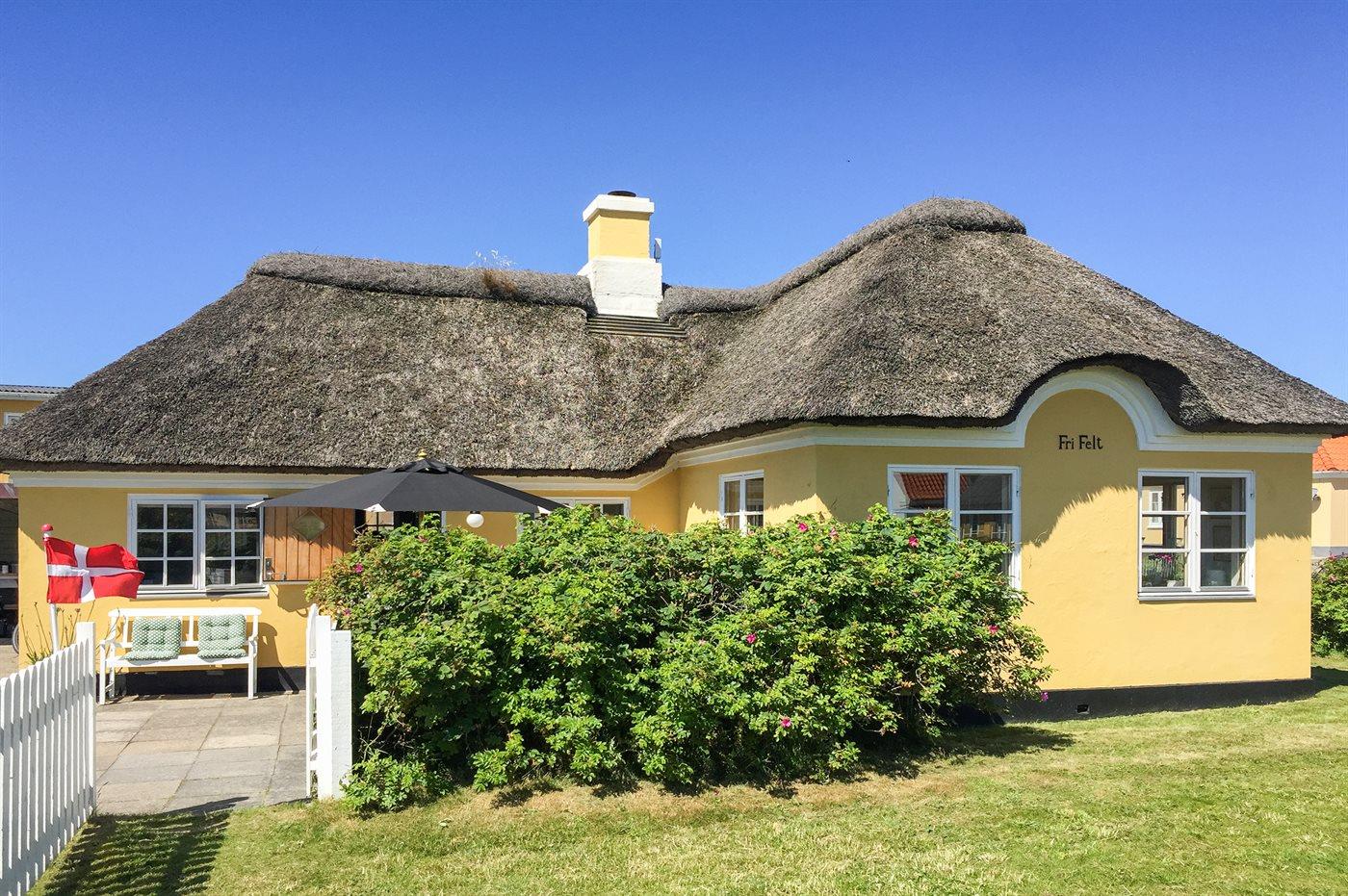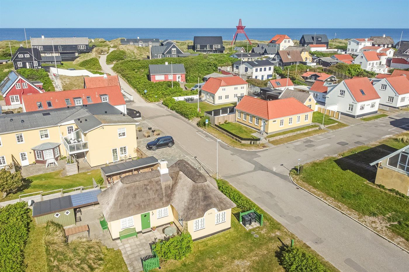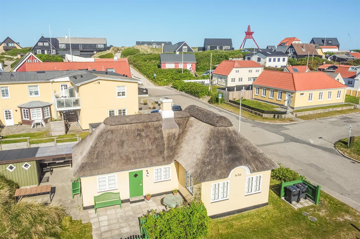 Charmerende og idyllisk sommerhus med stråtag og sprossede vinduer holdt i den oprindelige stil. Det hyggelige hus er beliggenden på en kuperet grund tæt på stranden og Vesterhavet og i kort afstand til centrum. Til huset hører flere solrige terrasser med gode muligheder for læ.