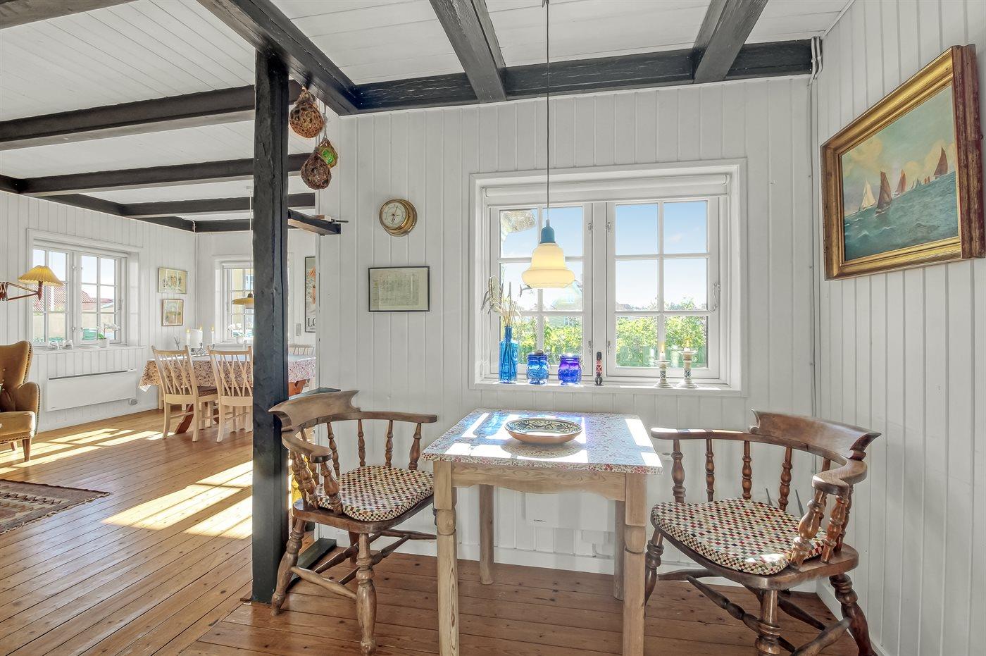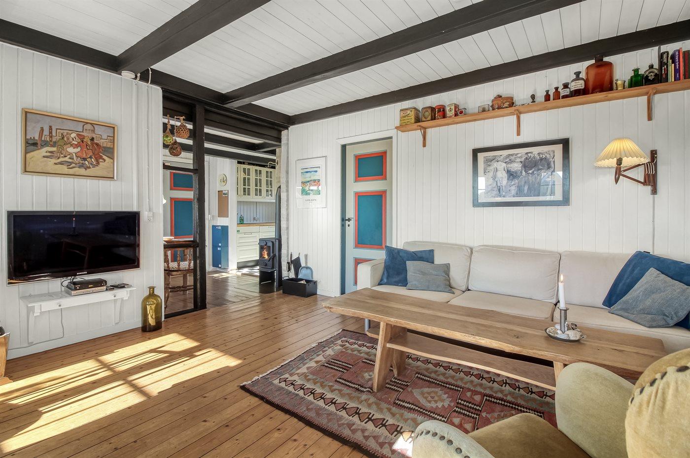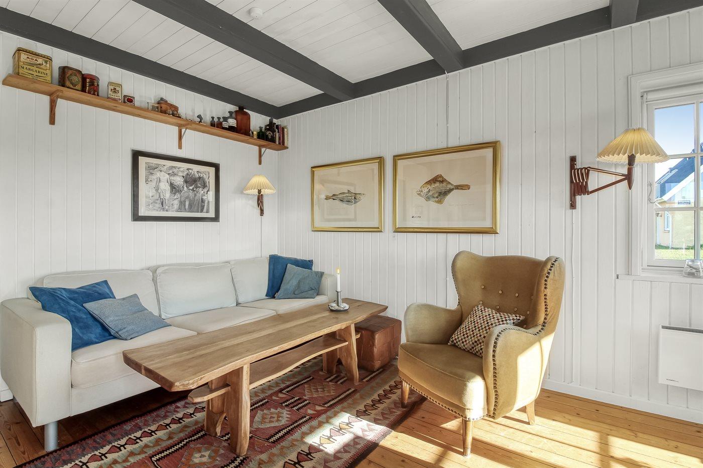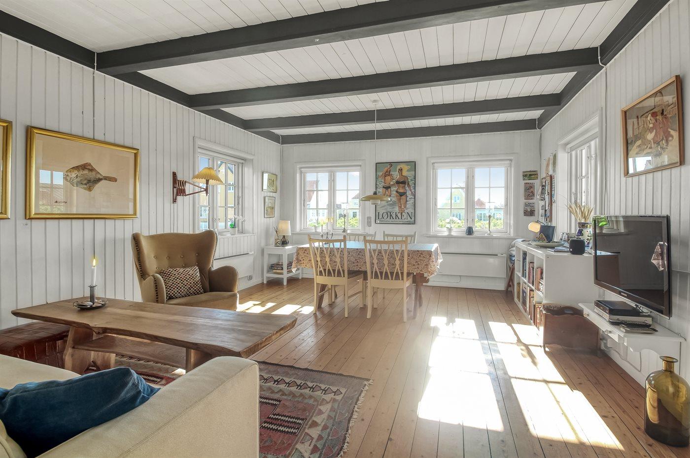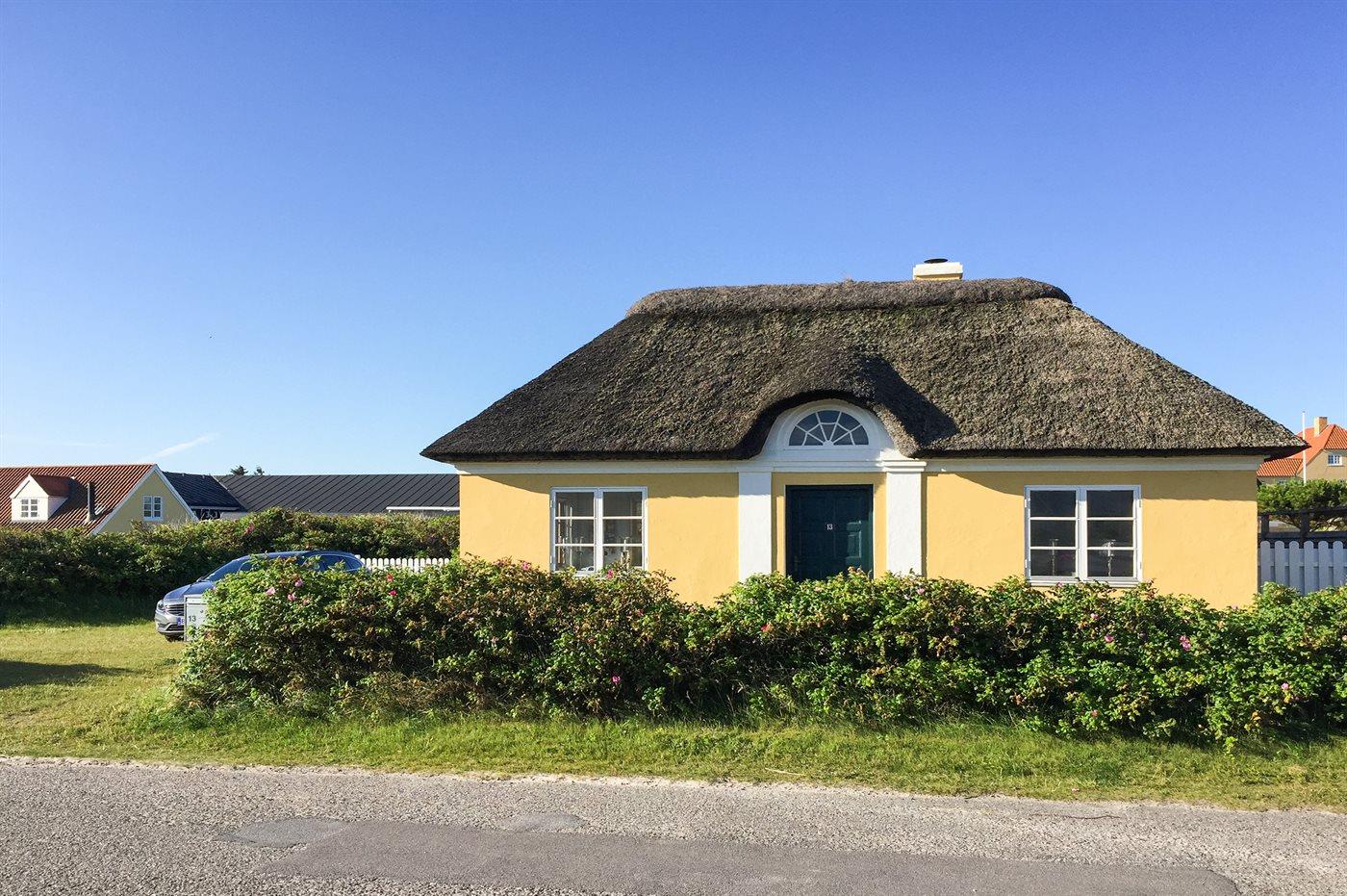 Charmerende og idyllisk sommerhus med stråtag og sprossede vinduer holdt i den oprindelige stil. Det hyggelige hus er beliggenden på en kuperet grund tæt på stranden og Vesterhavet og i kort afstand til centrum. Til huset hører flere solrige terrasser med gode muligheder for læ.