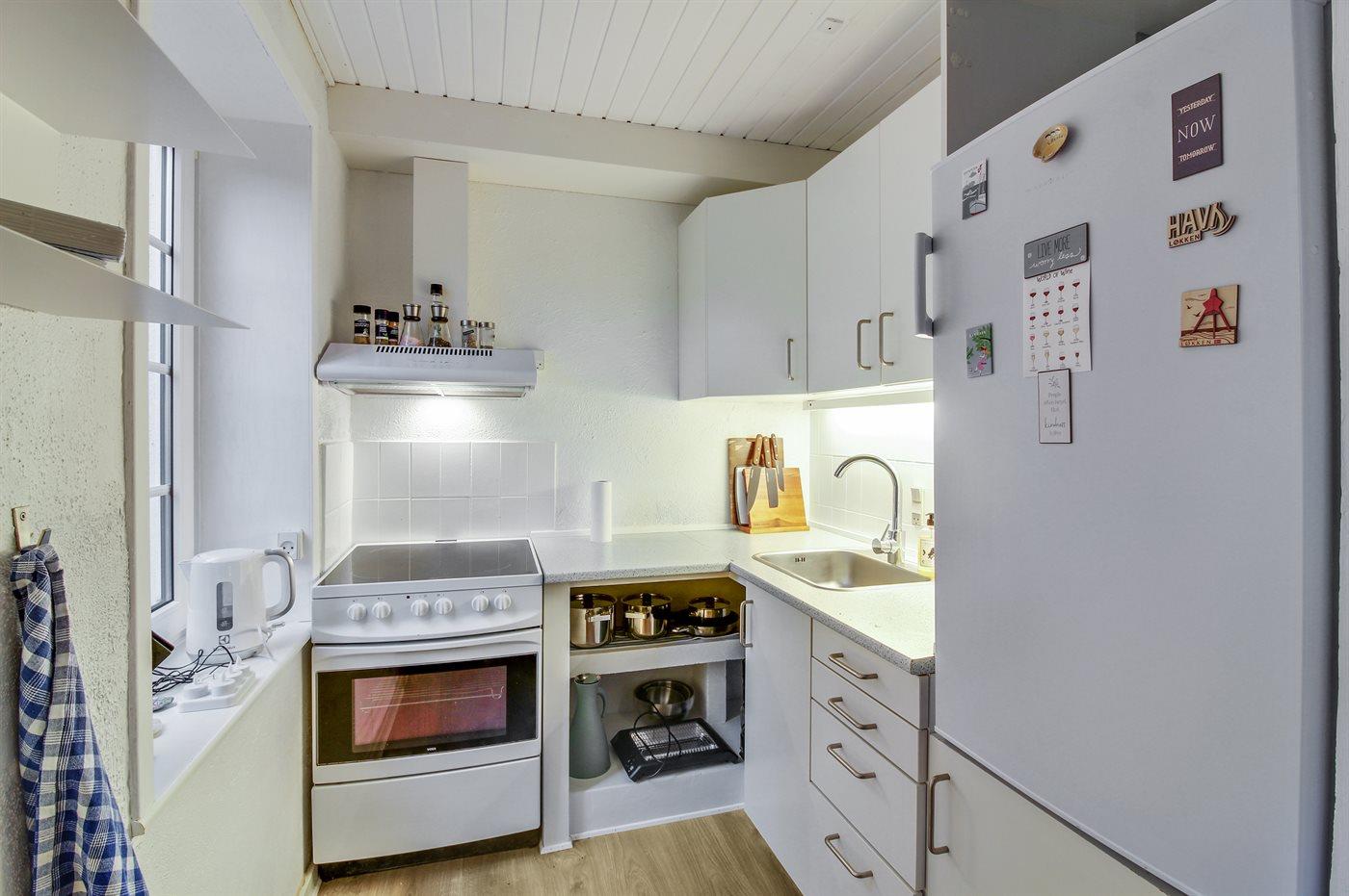Køkkenet er udstyret med 1 køleskab. Der er 4 keramiske kogeplader, varmluftovn.