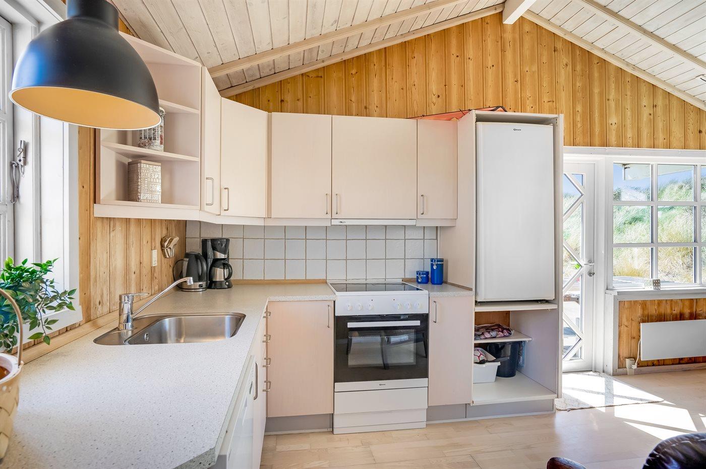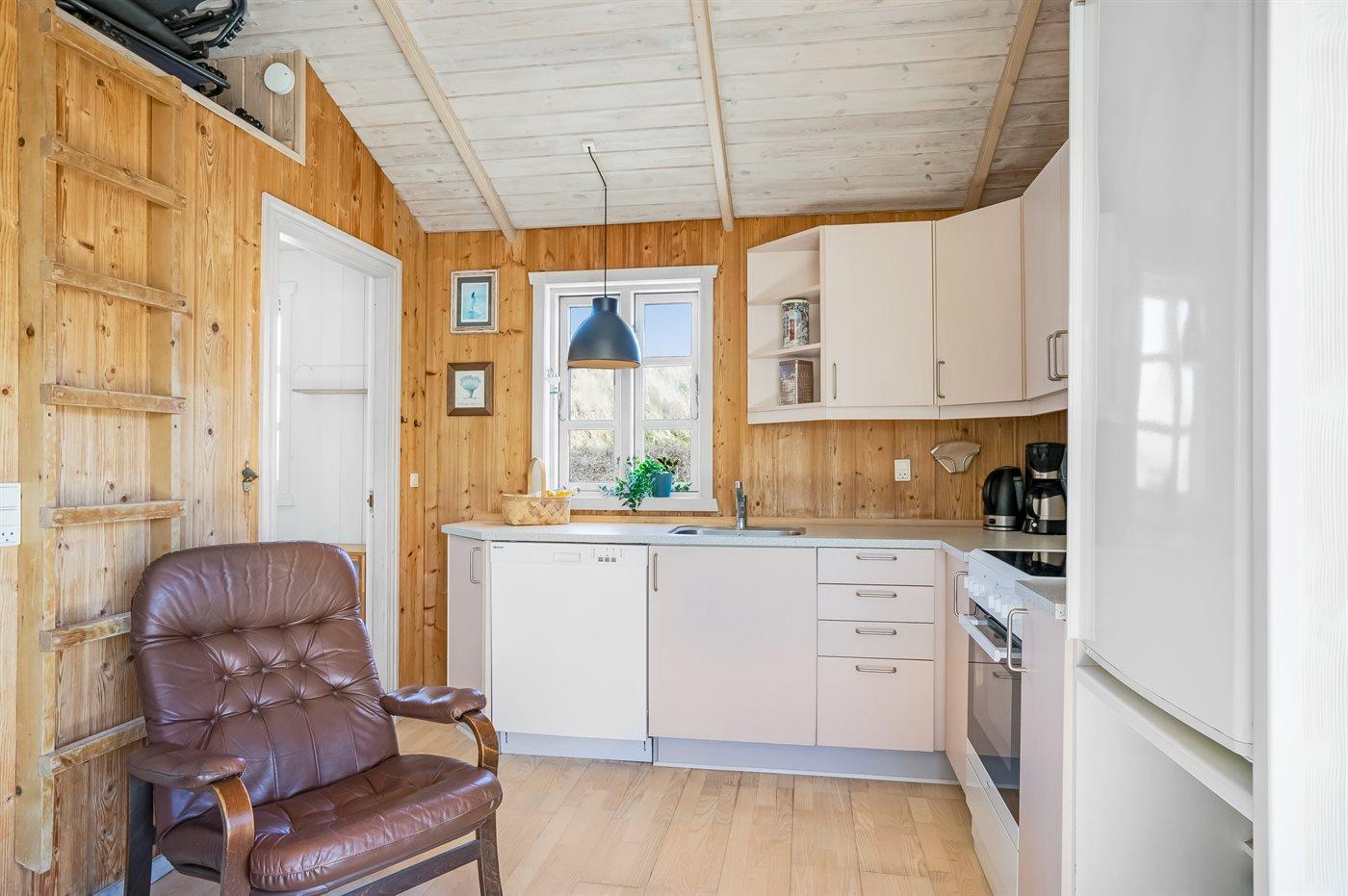 Køkkenet er udstyret med 1 køleskab. Der er 4 elkogeplader, bageovn samt opvaskemaskine.