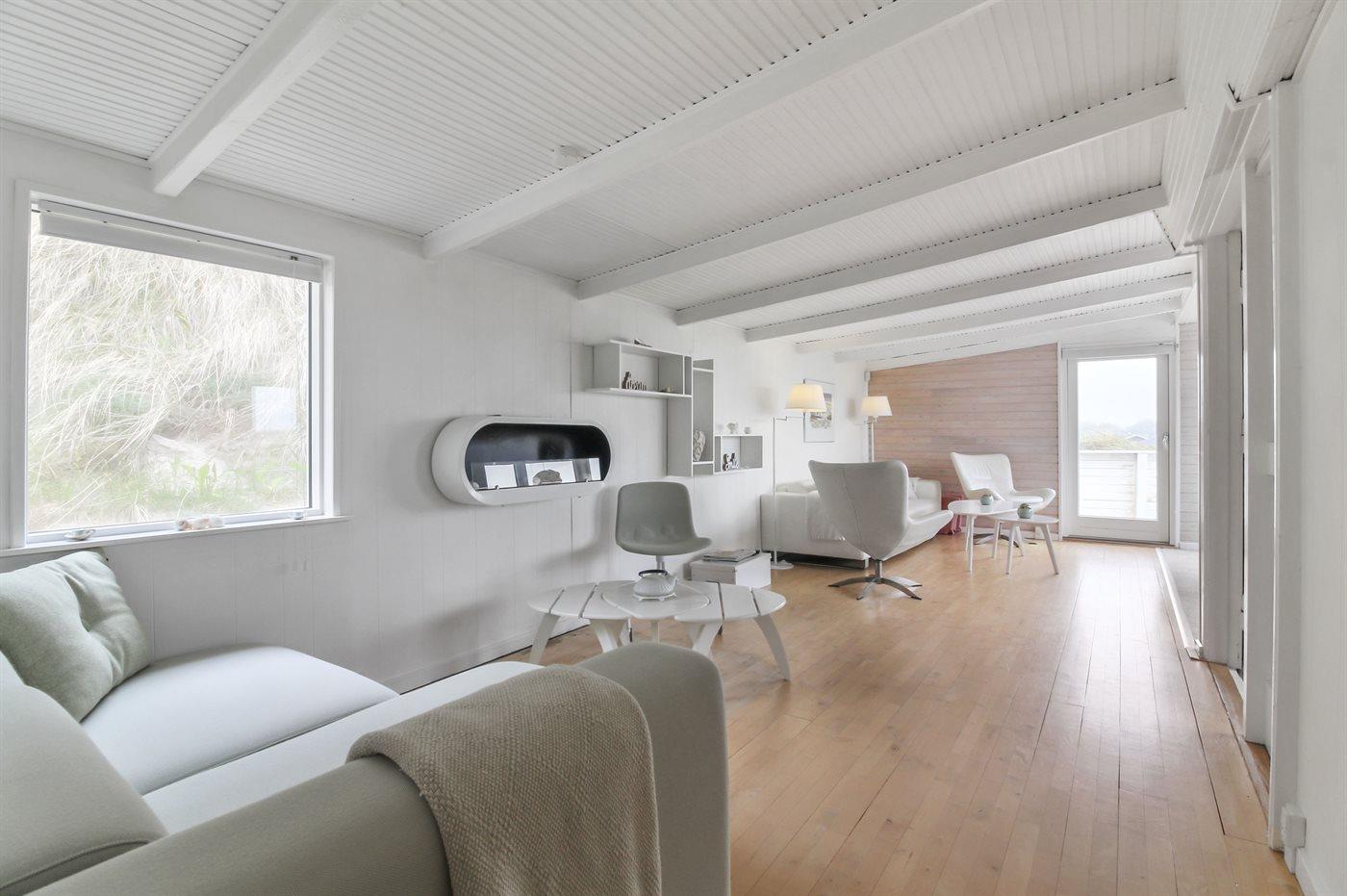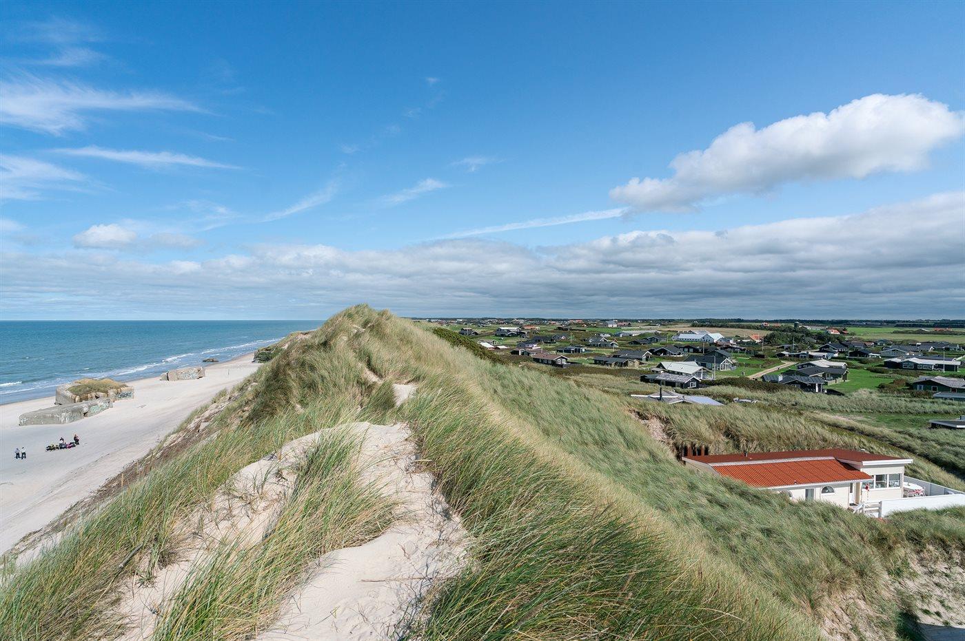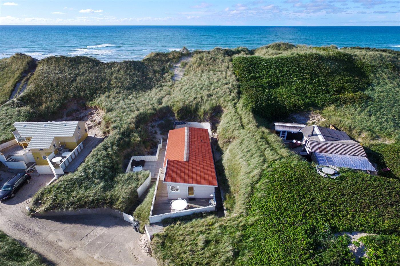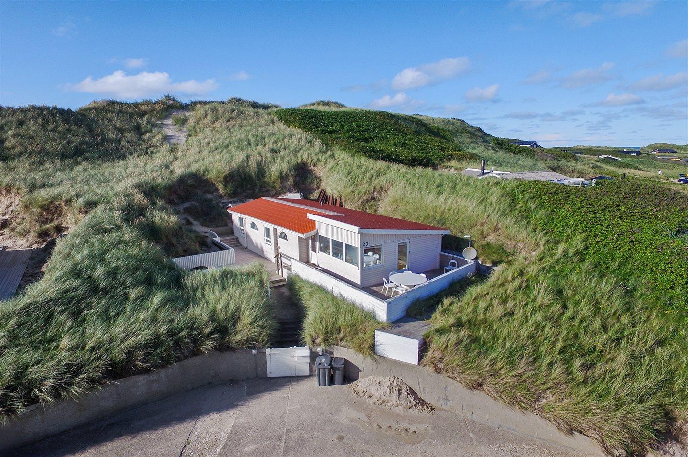 Kør ad de små veje helt ud til de høje klitter hvor dette skønne sommerhus ligger hævet over vejen i yderste klitrække til stranden og Vesterhavet. Huset er bygget ind i klitten i god læ for vestenvinden, og med sin høje beliggenhed er der fin udsigt over sommerhusområdet fra opholdsstuen. Fra toppen af grunden er der til gengæld havudsigt. Til huset hører en god lukket terrasse mod øst og syd.