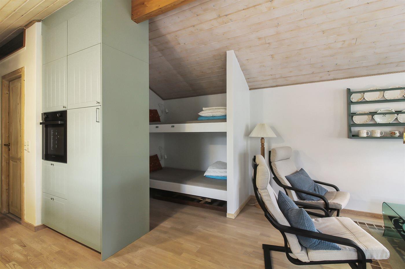 Der er i alt 1 soveværelse. Sovepladserne fordeler sig på: 2 sovepladser i dobbeltseng. 2 sovepladser i køjeseng. Derudover er der 1 stk. barneseng.